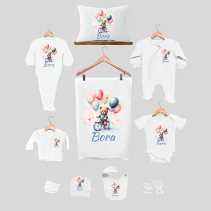 11’li Hastane Çıkış Seti İsme Özel Bisikletli Ayıcık Desenli