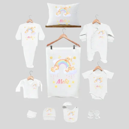 11’li Hastane Çıkış Seti İsme Özel Gökkuşağı Desenli