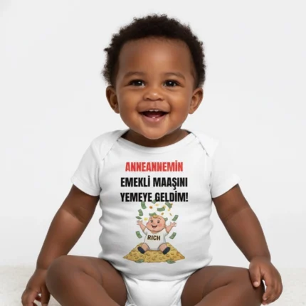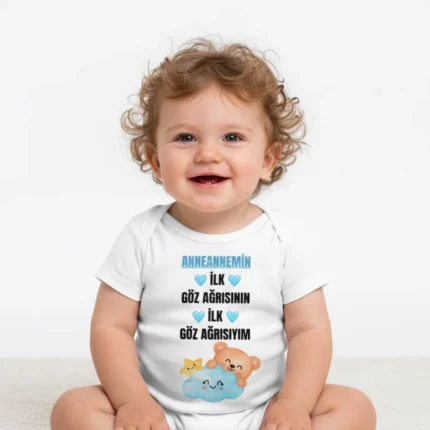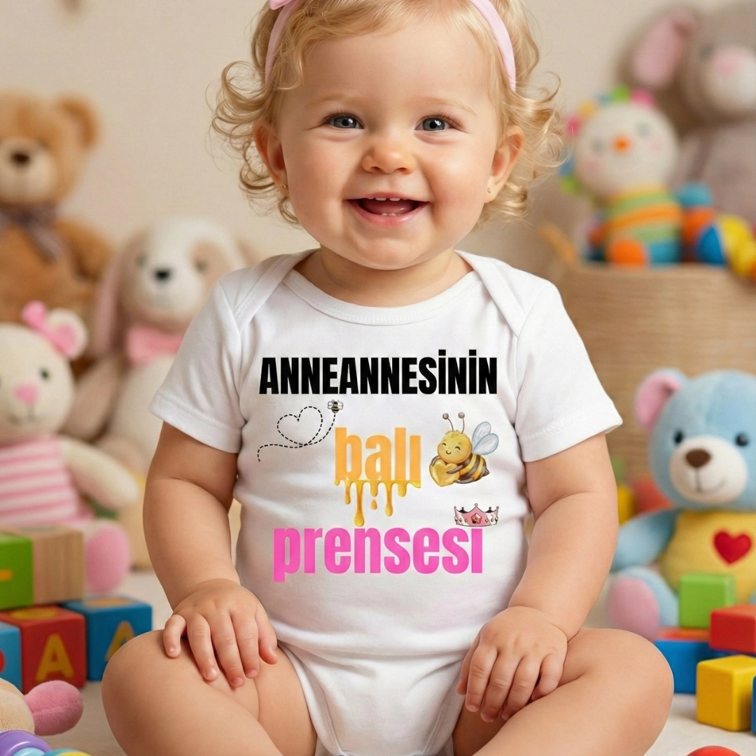 Anneannesinin Balı Prensesi Baskılı Zıbın – zarf yaka, çıtçıtlı, rahat kalıp %100 pamuk interlok body.