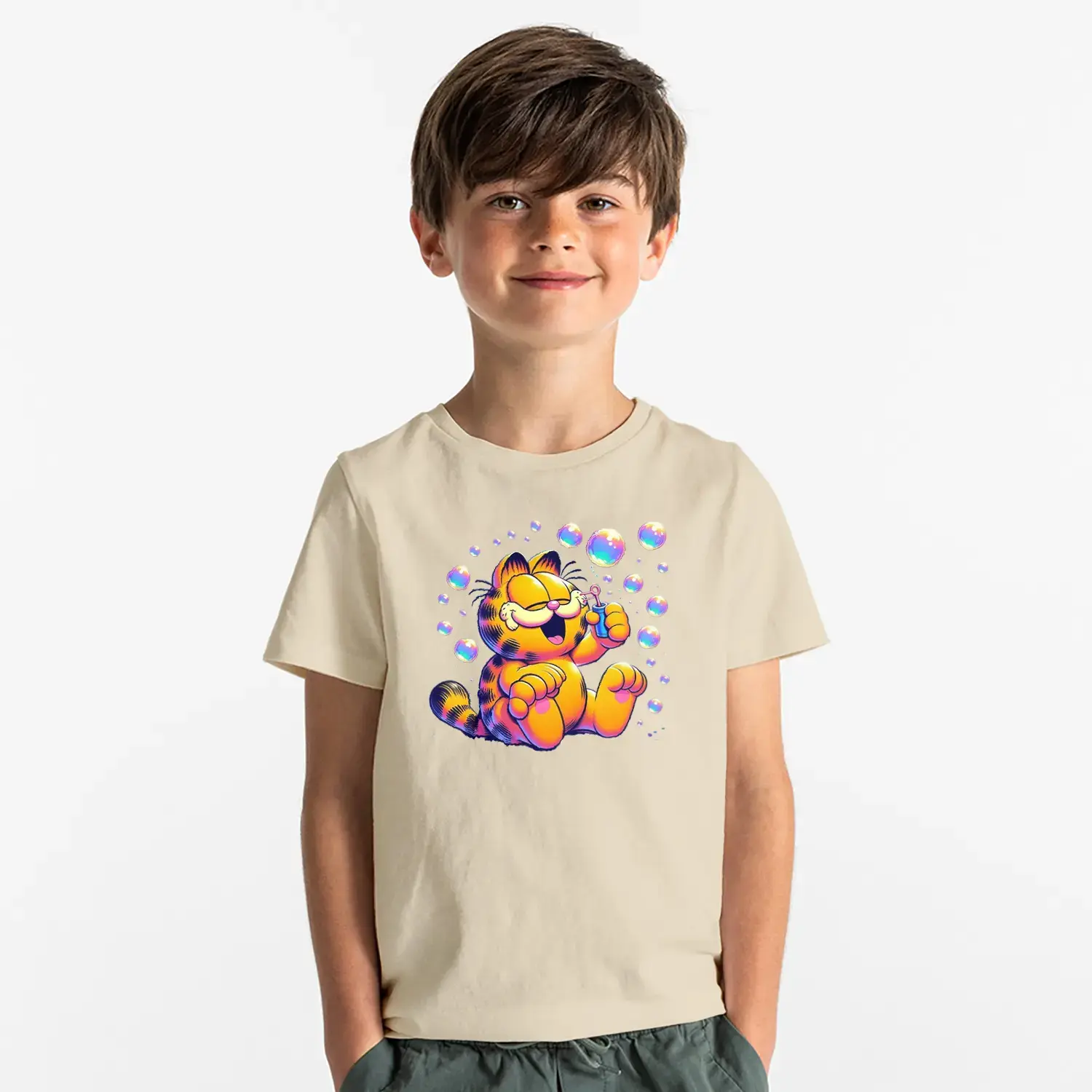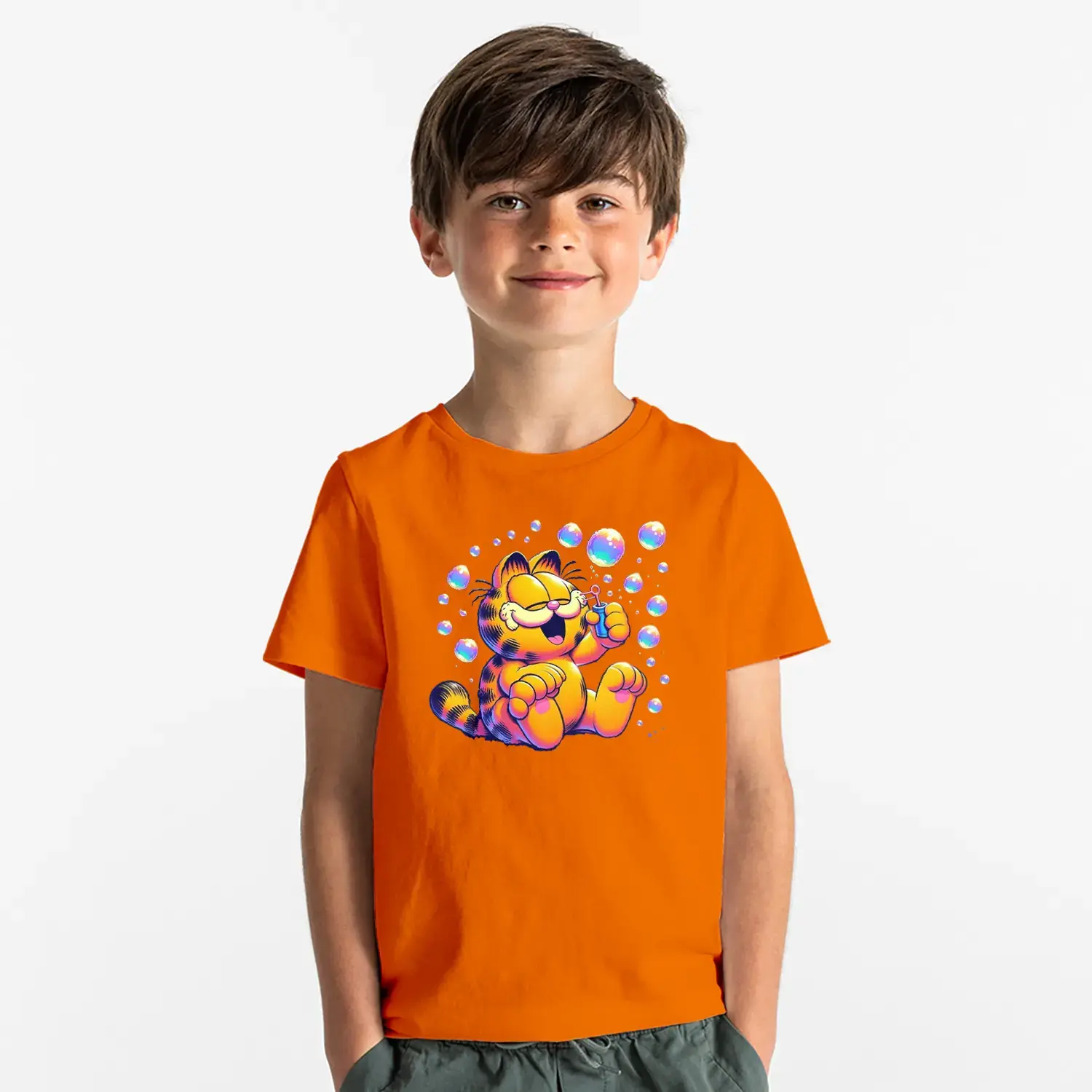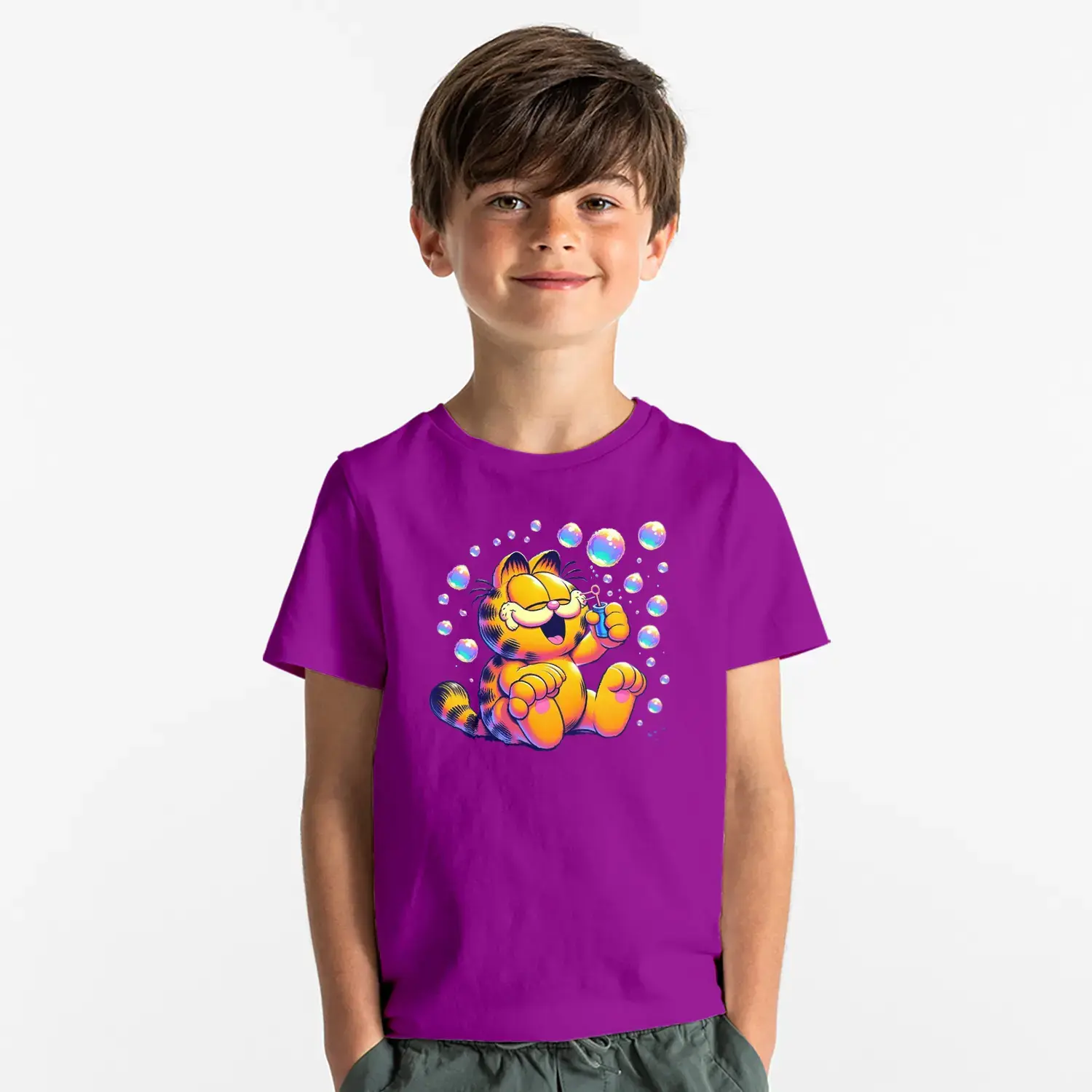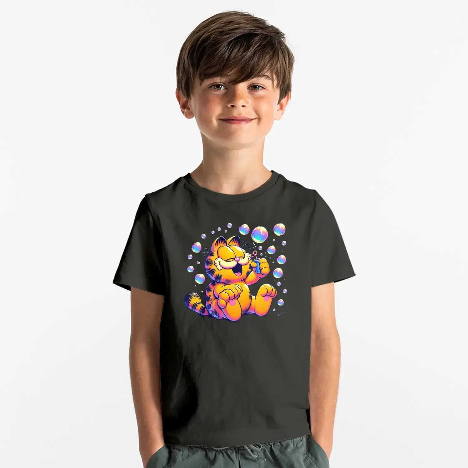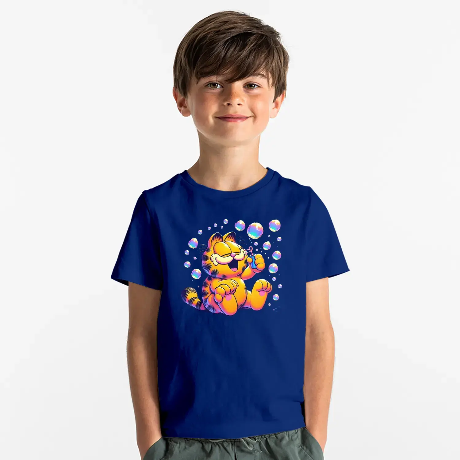 Baloncuklu Sevimli Kedi Çizgi Karakter Baskılı Erkek Çocuk Tişört