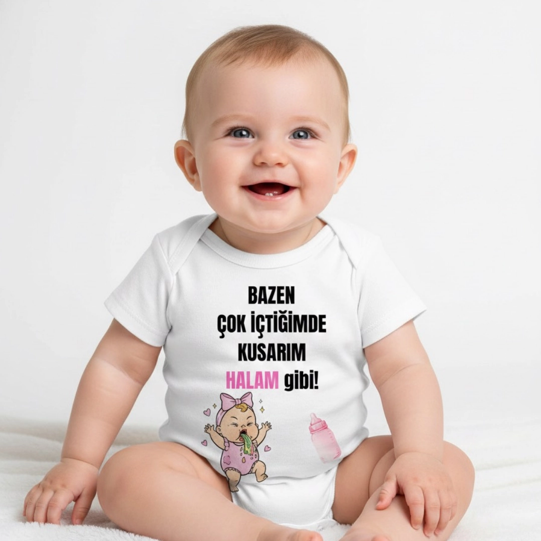 Bazen Çok İçtiğimde Kusarım Halam Gibi Baskılı Zıbın – zarf yaka, çıtçıtlı, rahat kalıp %100 pamuk interlok body.