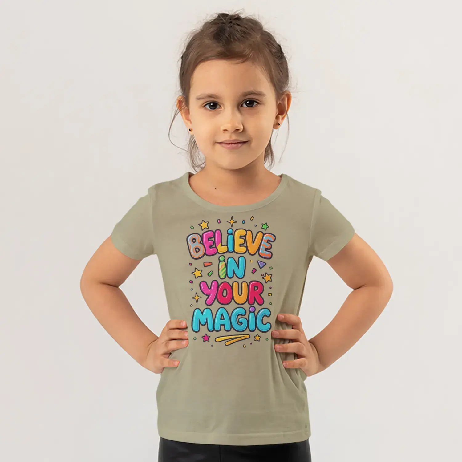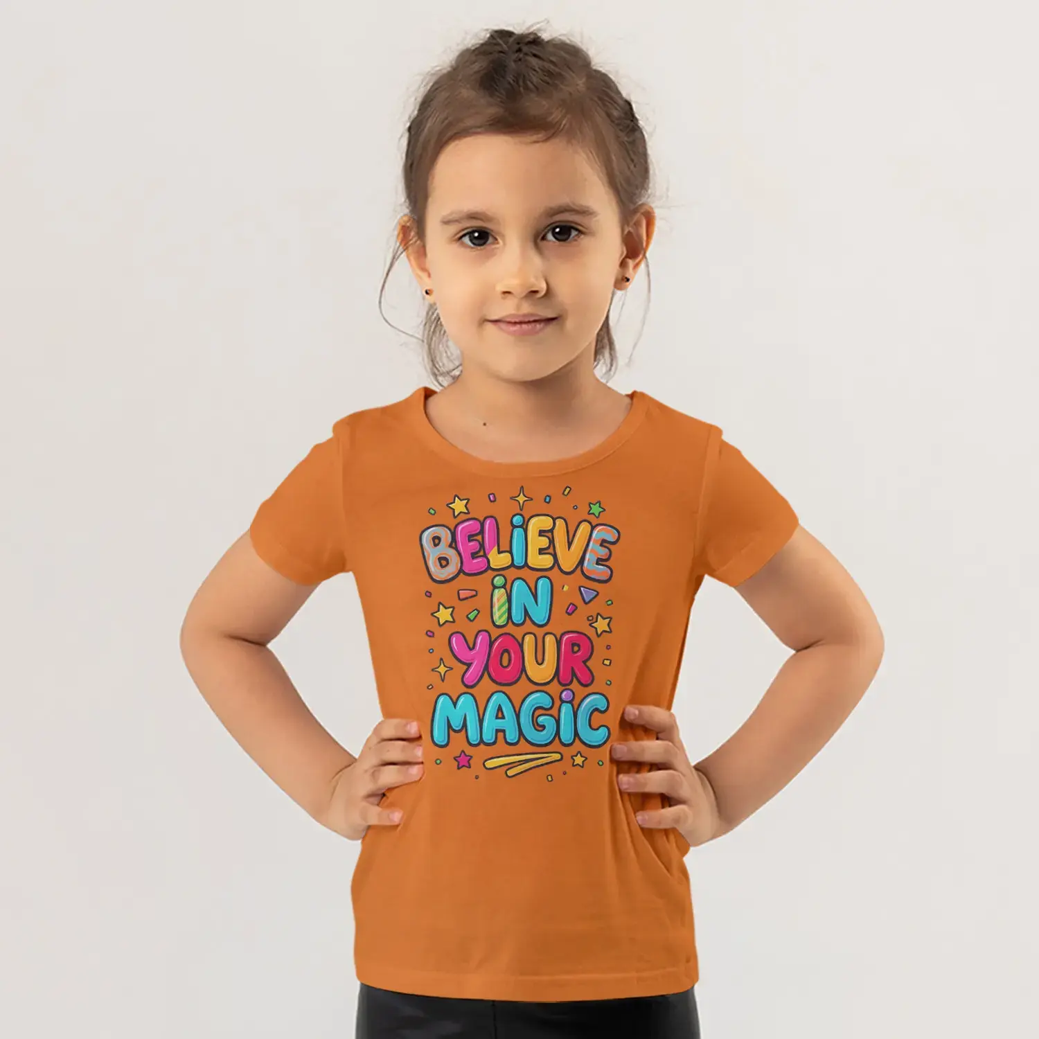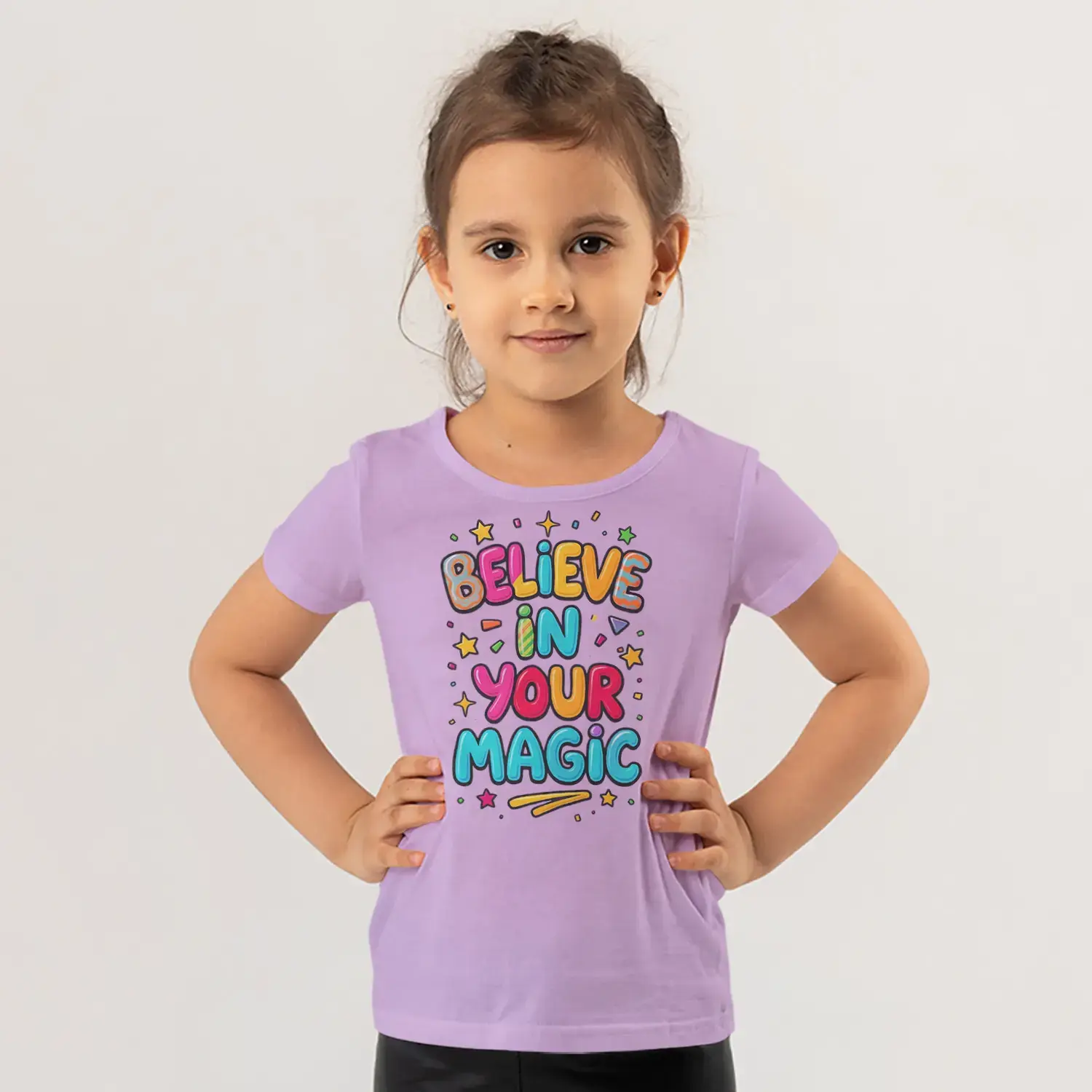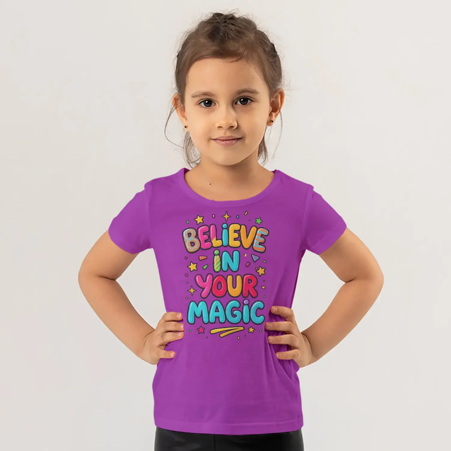 Believe In Your Magic Renkli Yıldızlı Motivasyon Yazı Baskılı Kız Çocuk Tişörtü