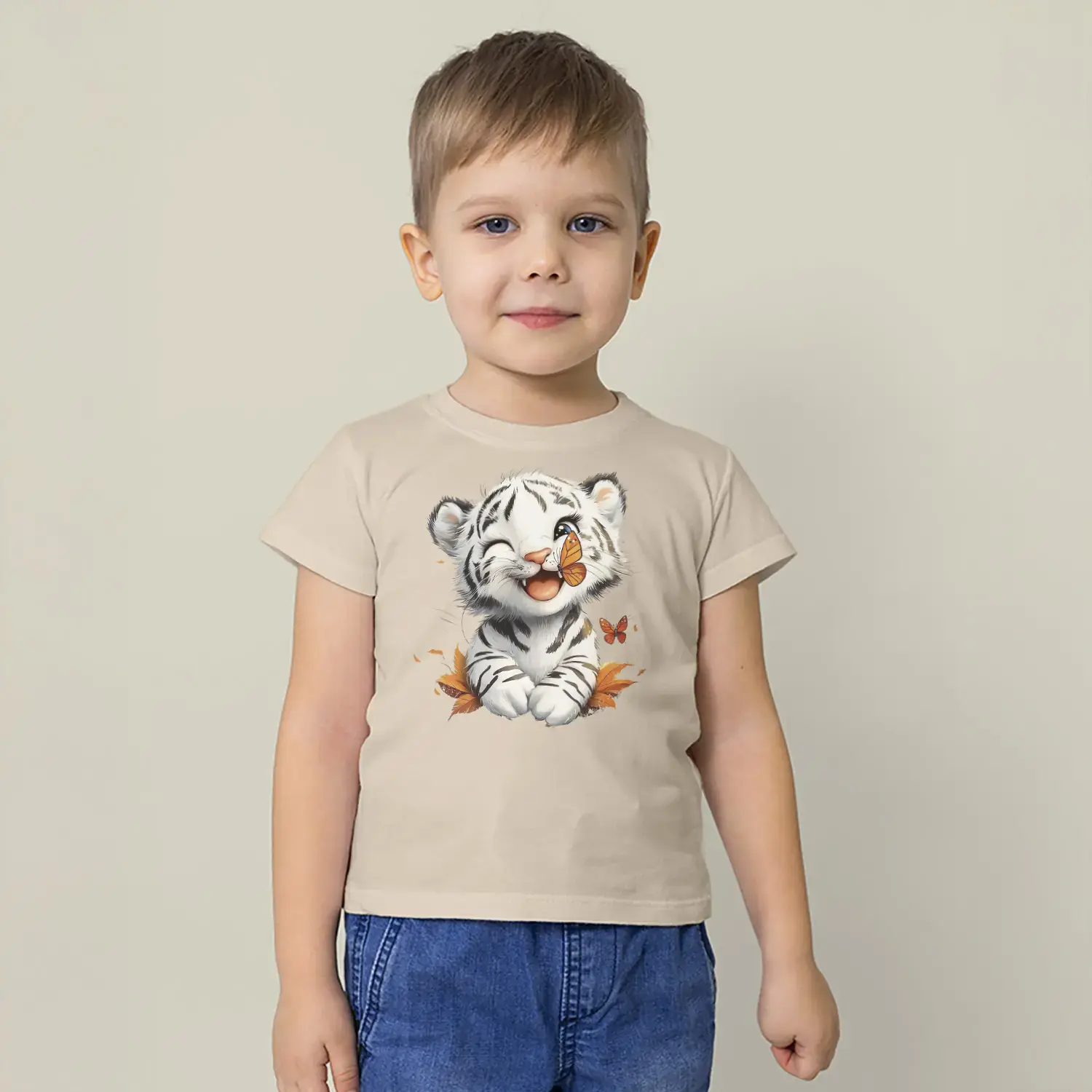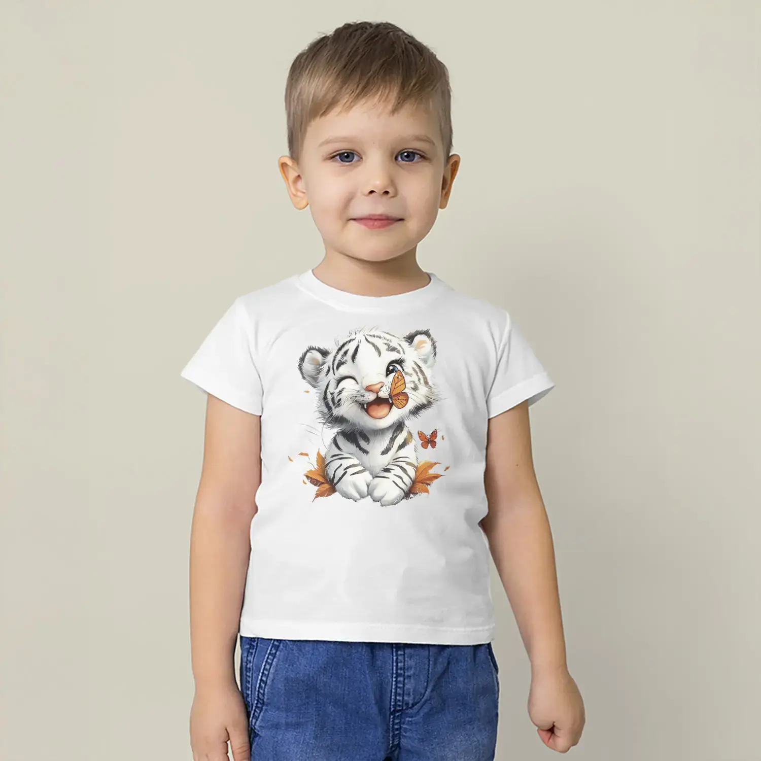 Beyaz Kaplan Yavrusu Kelebek Baskılı Erkek Çocuk Tişört
