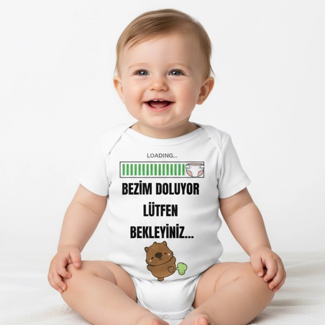 Bezim Doluyor Lütfen Bekleyiniz Baskılı Zıbın – zarf yaka, çıtçıtlı, rahat kalıp %100 pamuk interlok body.