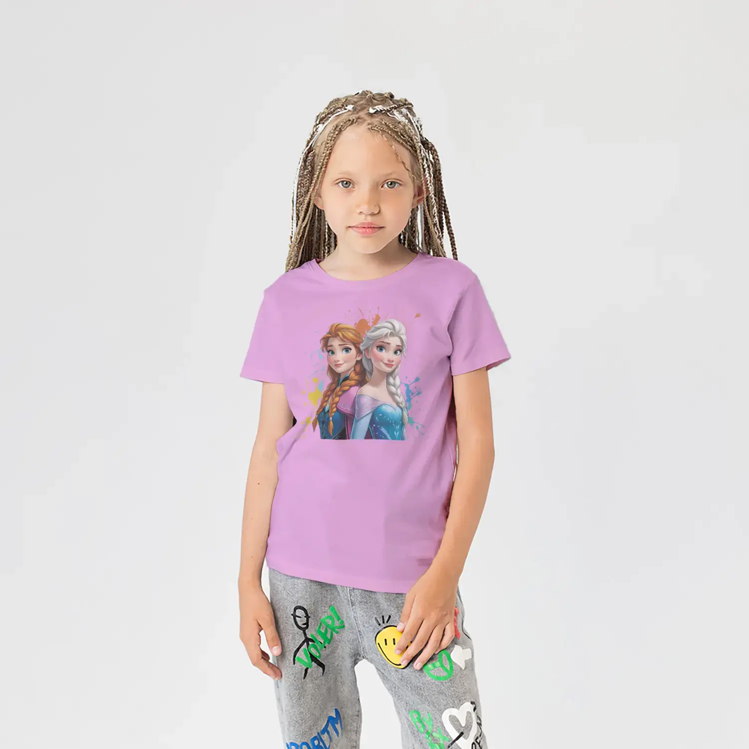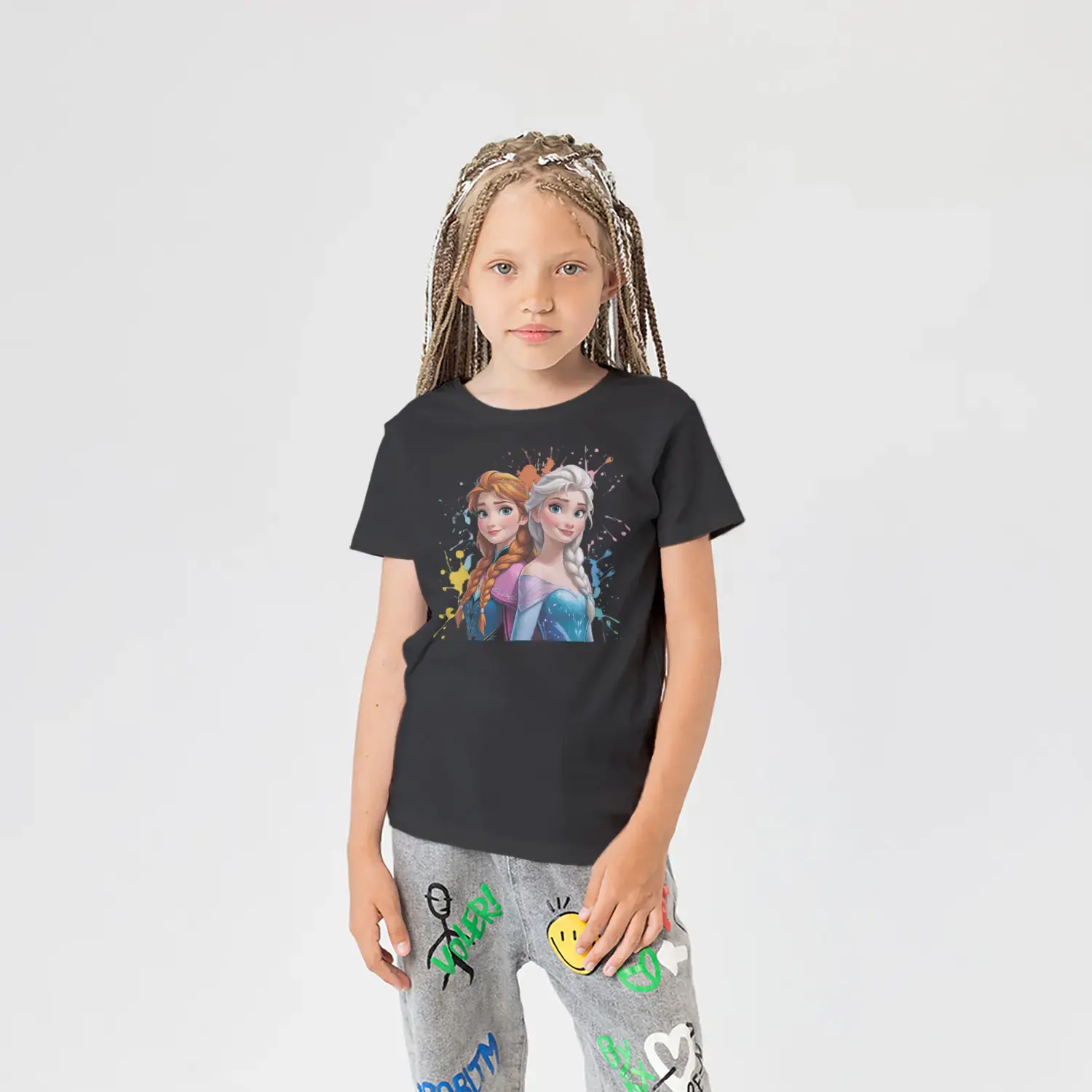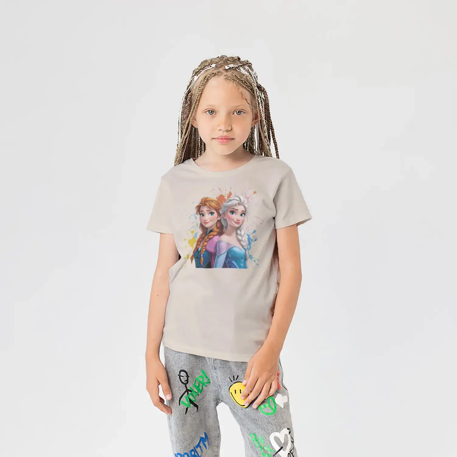Boya Sıçramalı İki Kardeş Buz Prensesi Figürlü Kız Çocuk Tişörtü
