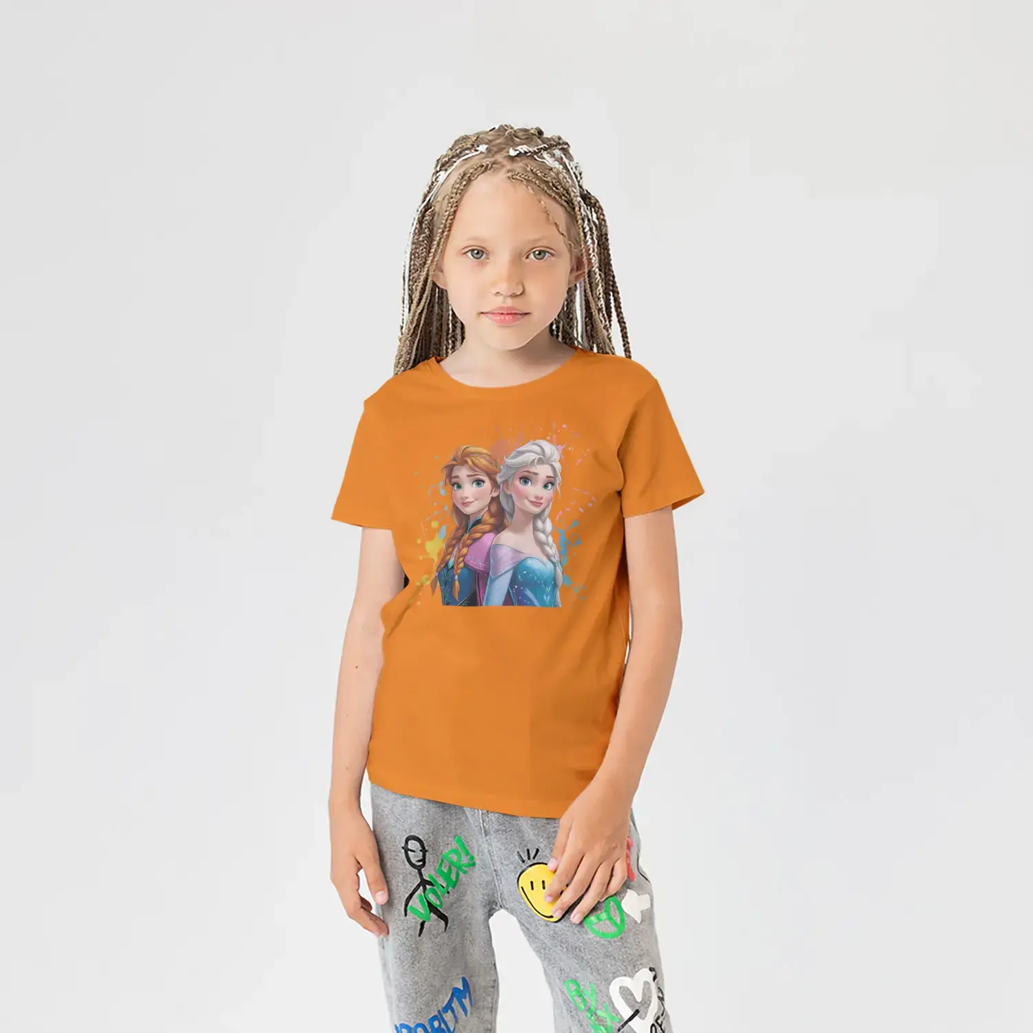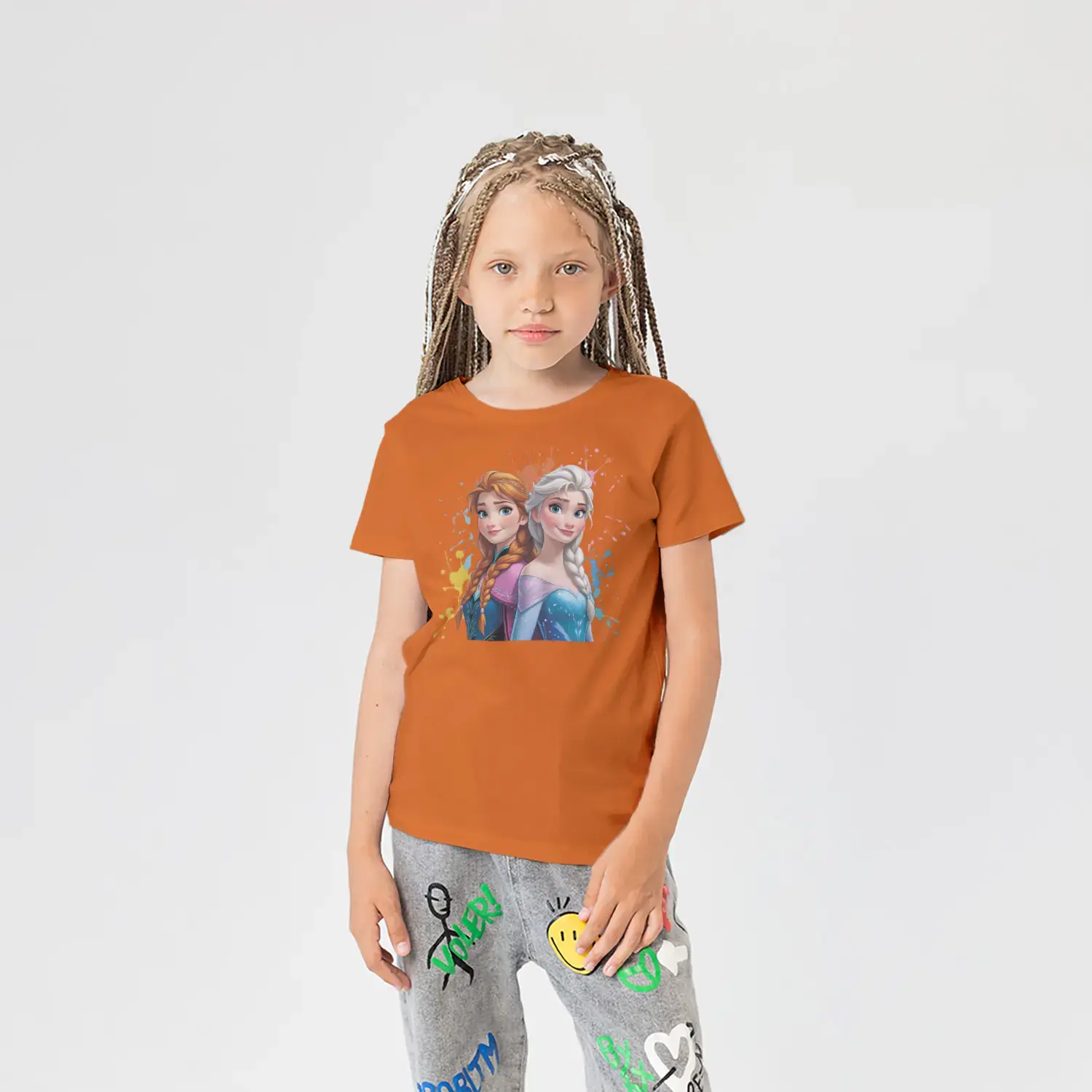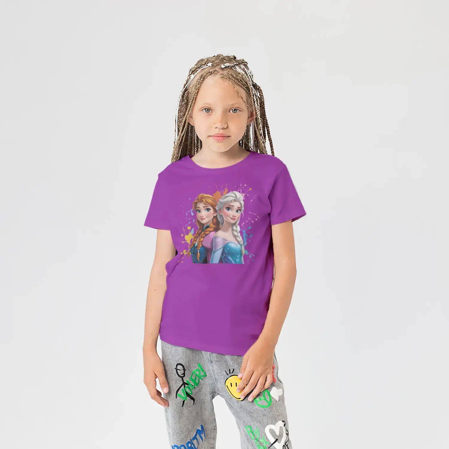 Boya Sıçramalı İki Kardeş Buz Prensesi Figürlü Kız Çocuk Tişörtü