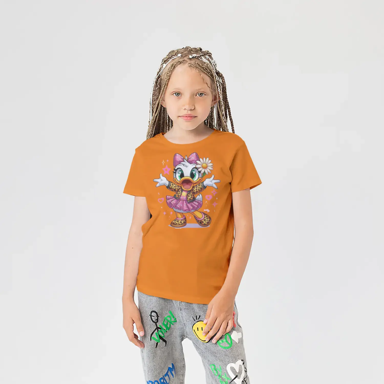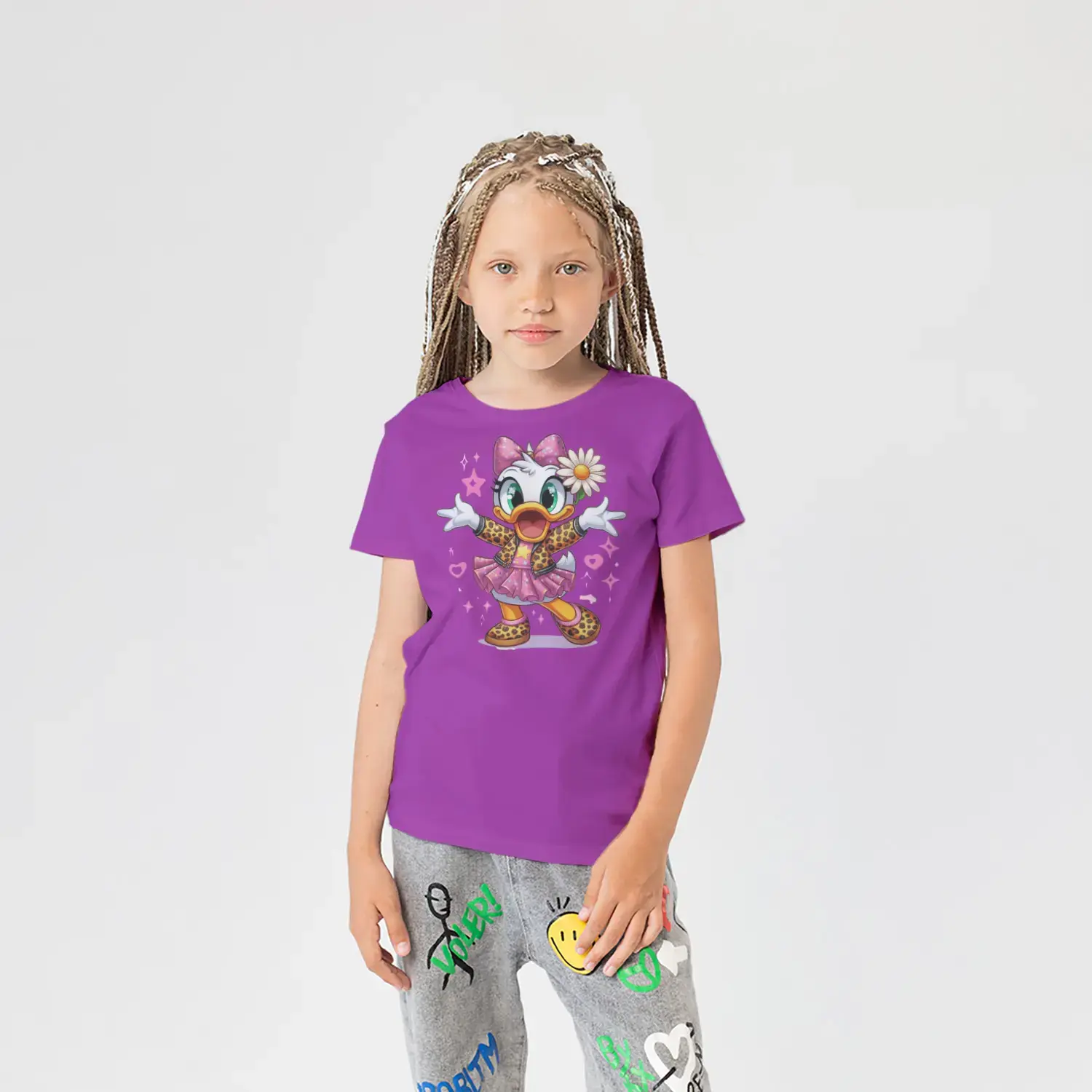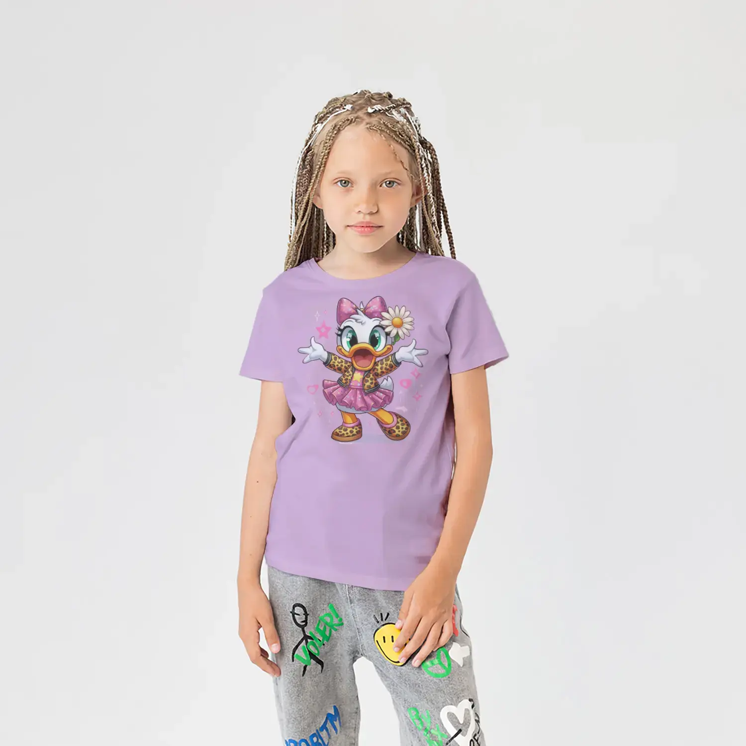 Çiçekli Şık Ördek Kız Figürlü Renkli Baskılı Kız Çocuk Tişörtü