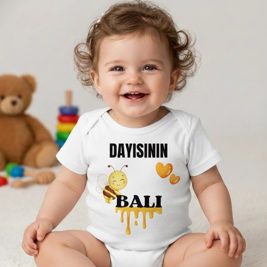 Dayısının Balı Baskılı Zıbın – zarf yaka, çıtçıtlı, rahat kalıp %100 pamuk interlok body.