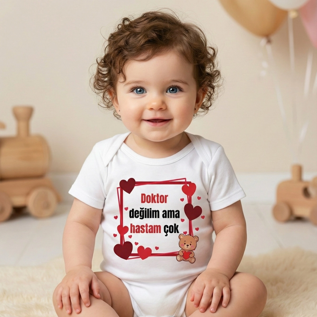 Doktor Değilim Ama Hastam Çok Baskılı Zıbın – zarf yaka, çıtçıtlı, rahat kalıp %100 pamuk interlok body.
