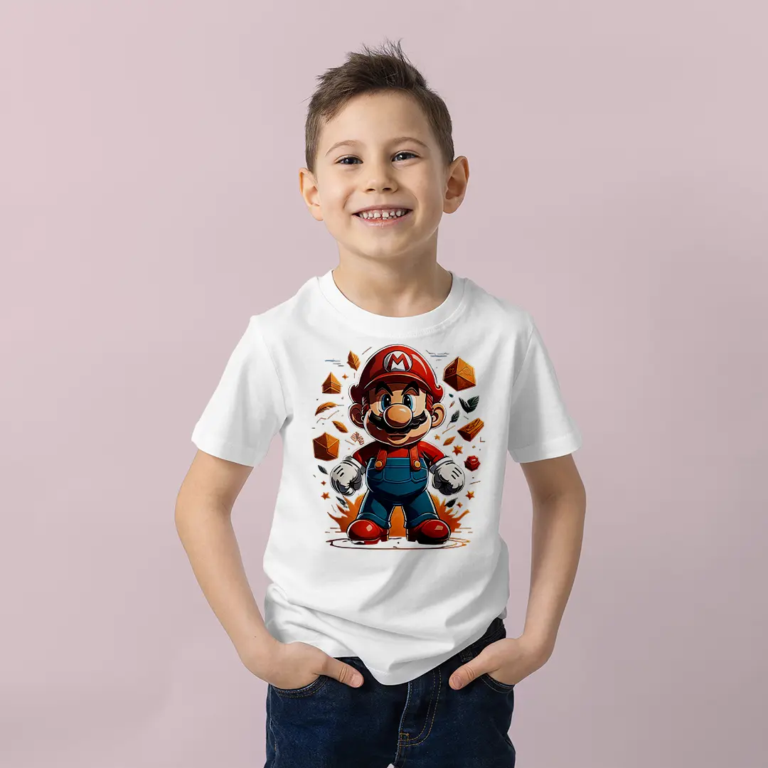 Erkek Çocuk Super Mario Renkli Splash Baskılı Tişört – Oyun Karakteri Çocuk Tişört