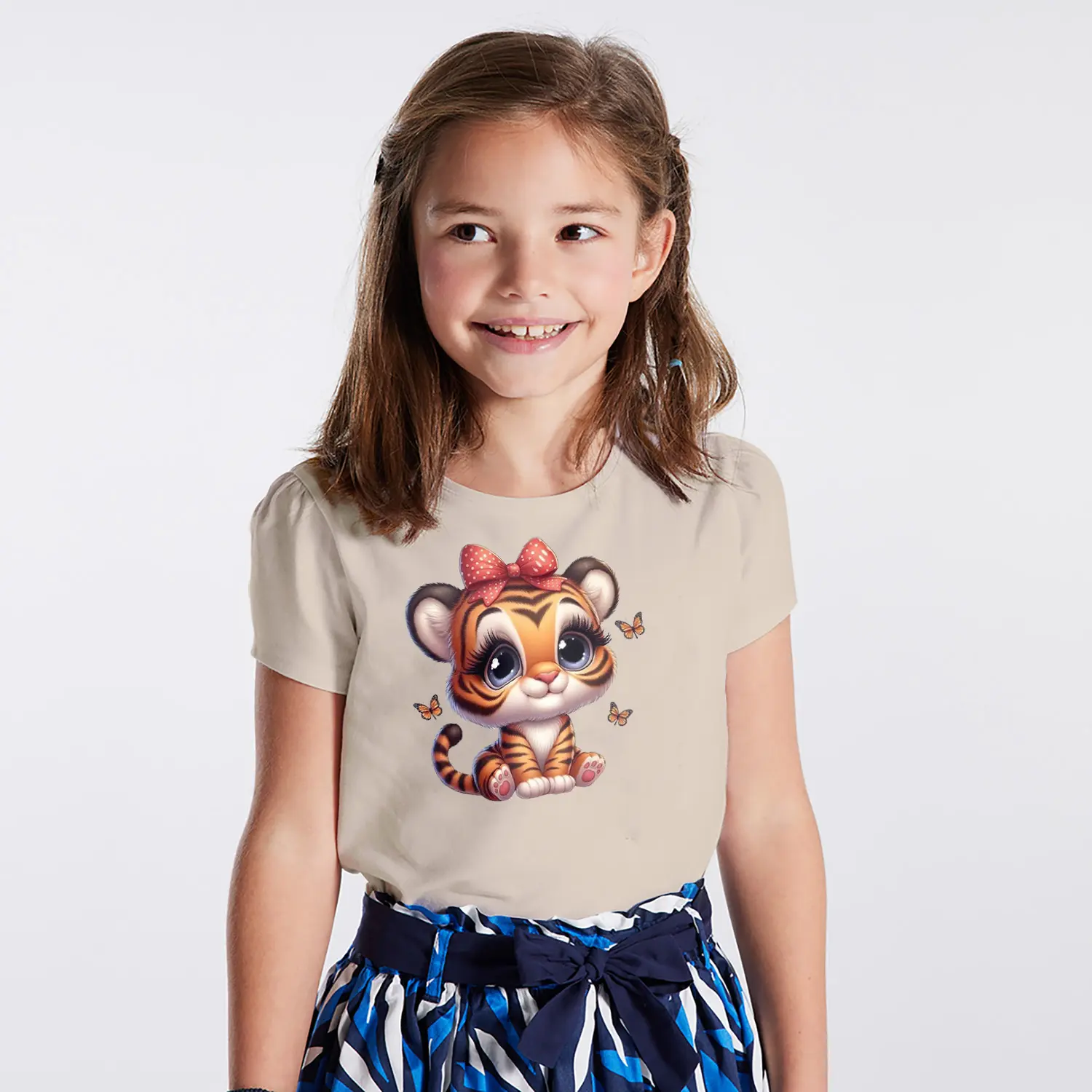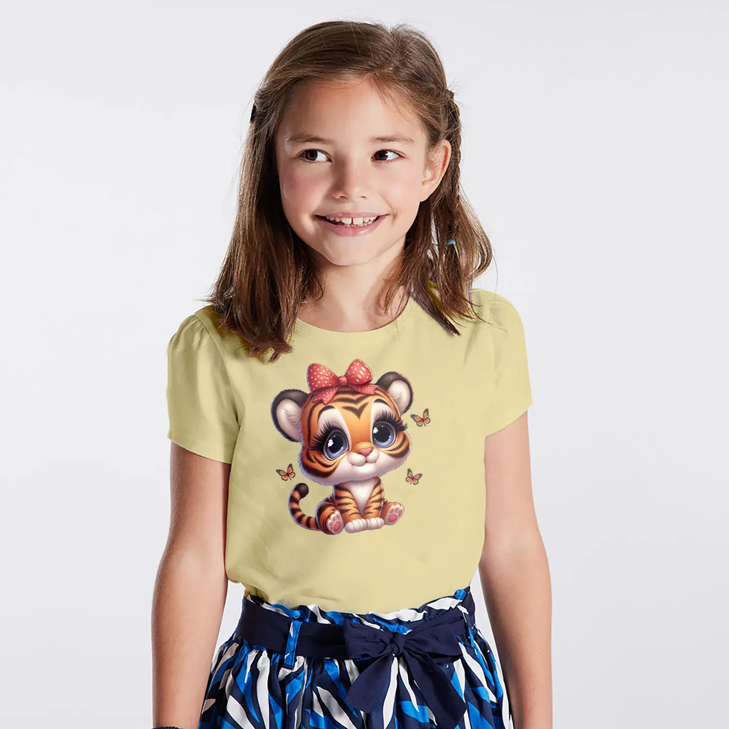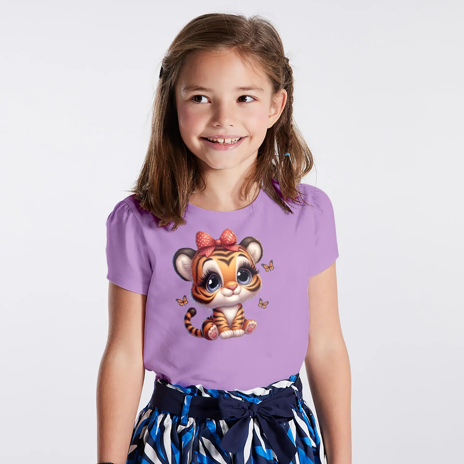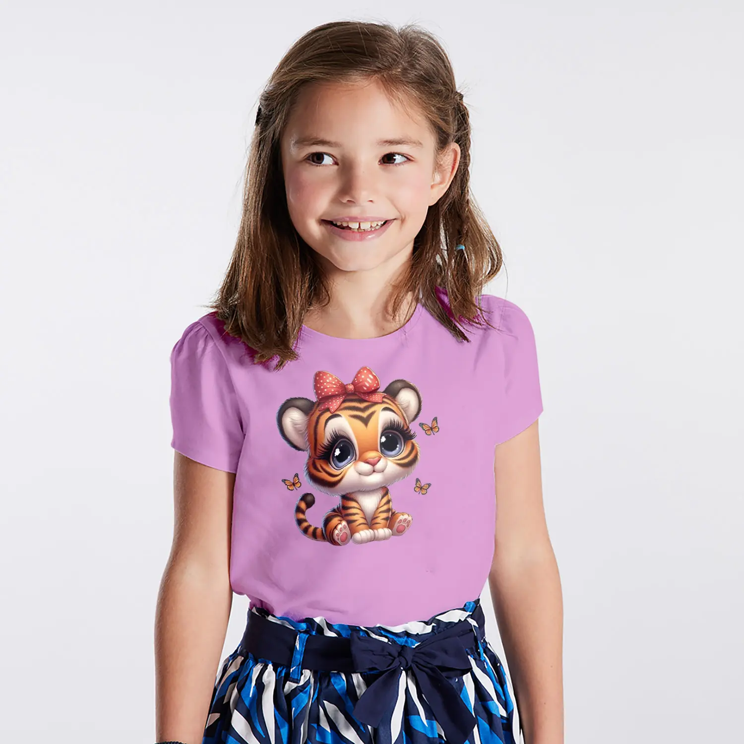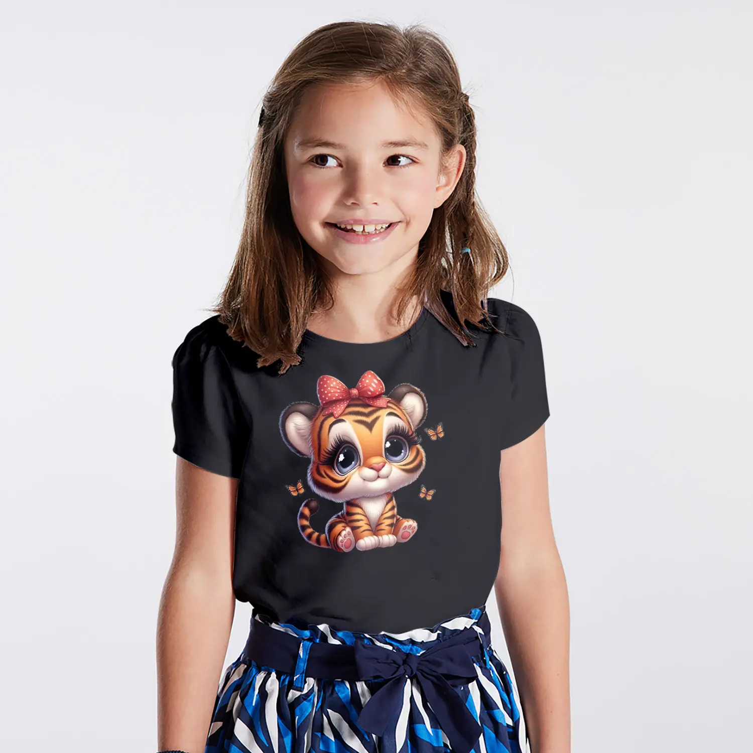 Fiyonklu Kelebek Desenli Sevimli Kaplan Yavrusu Figürlü Baskılı Kız Çocuk Tişörtü