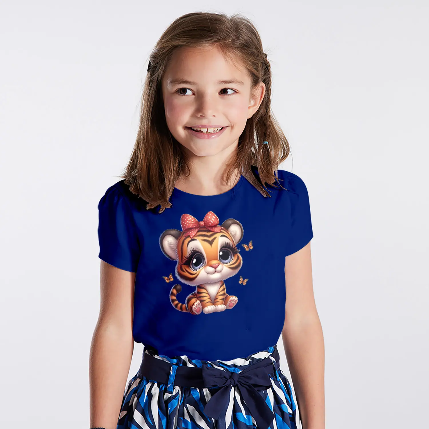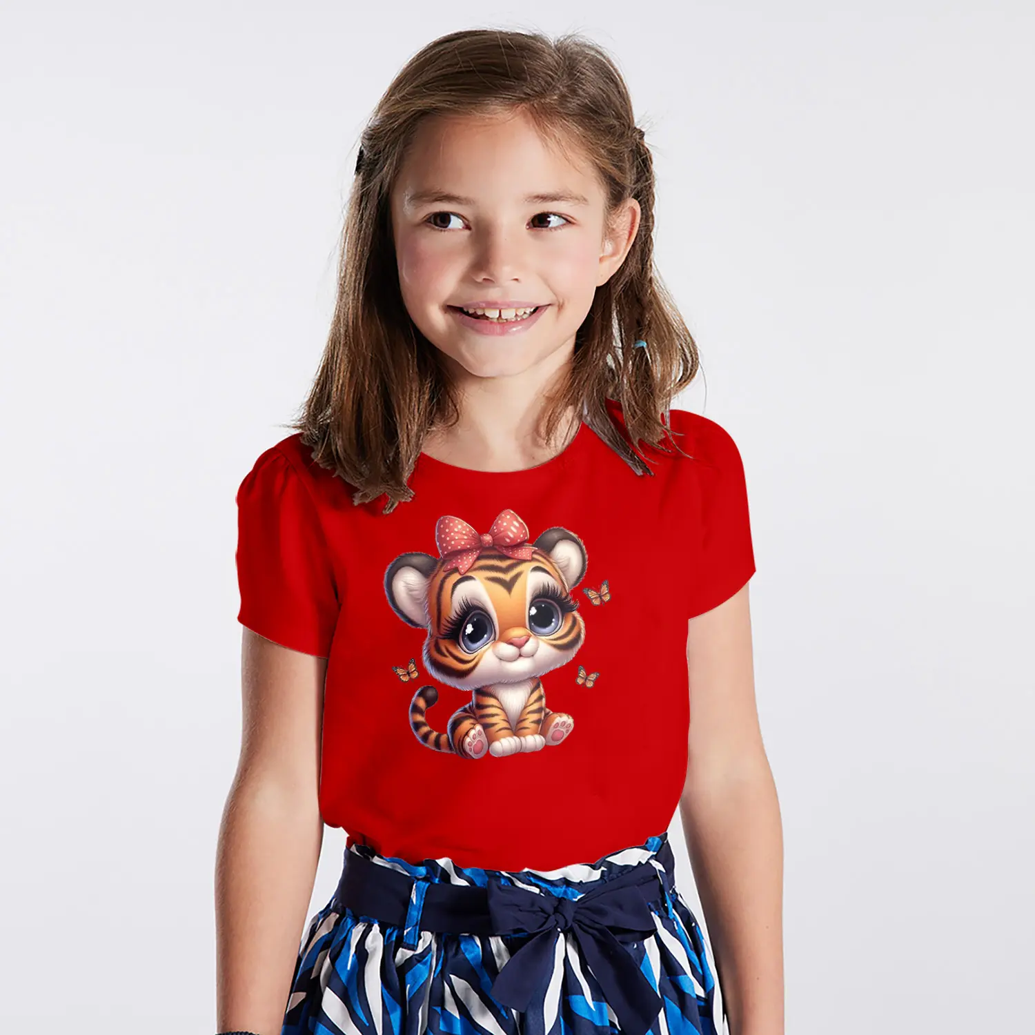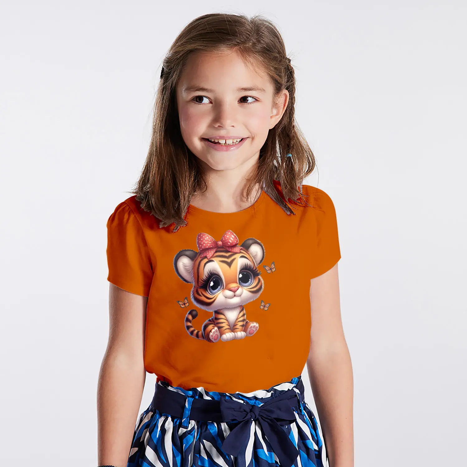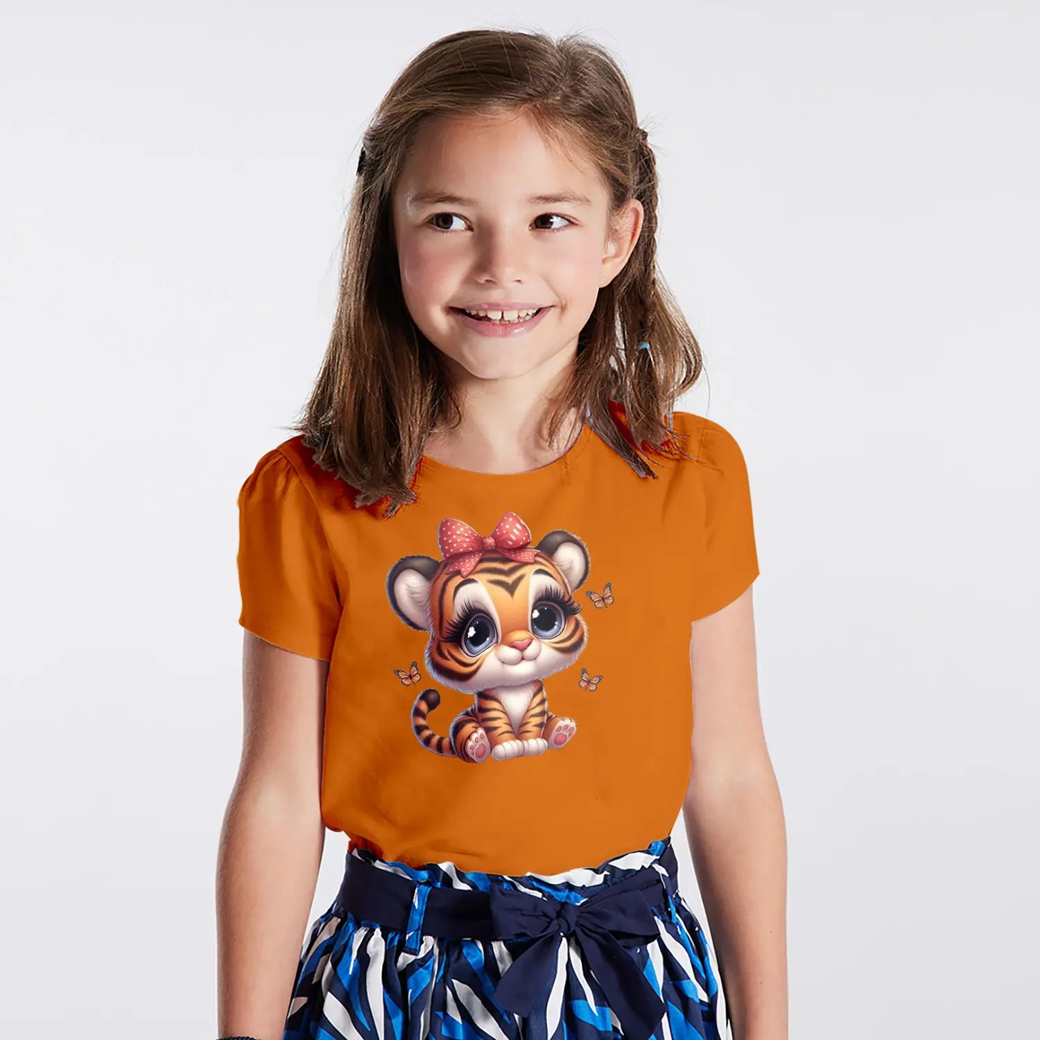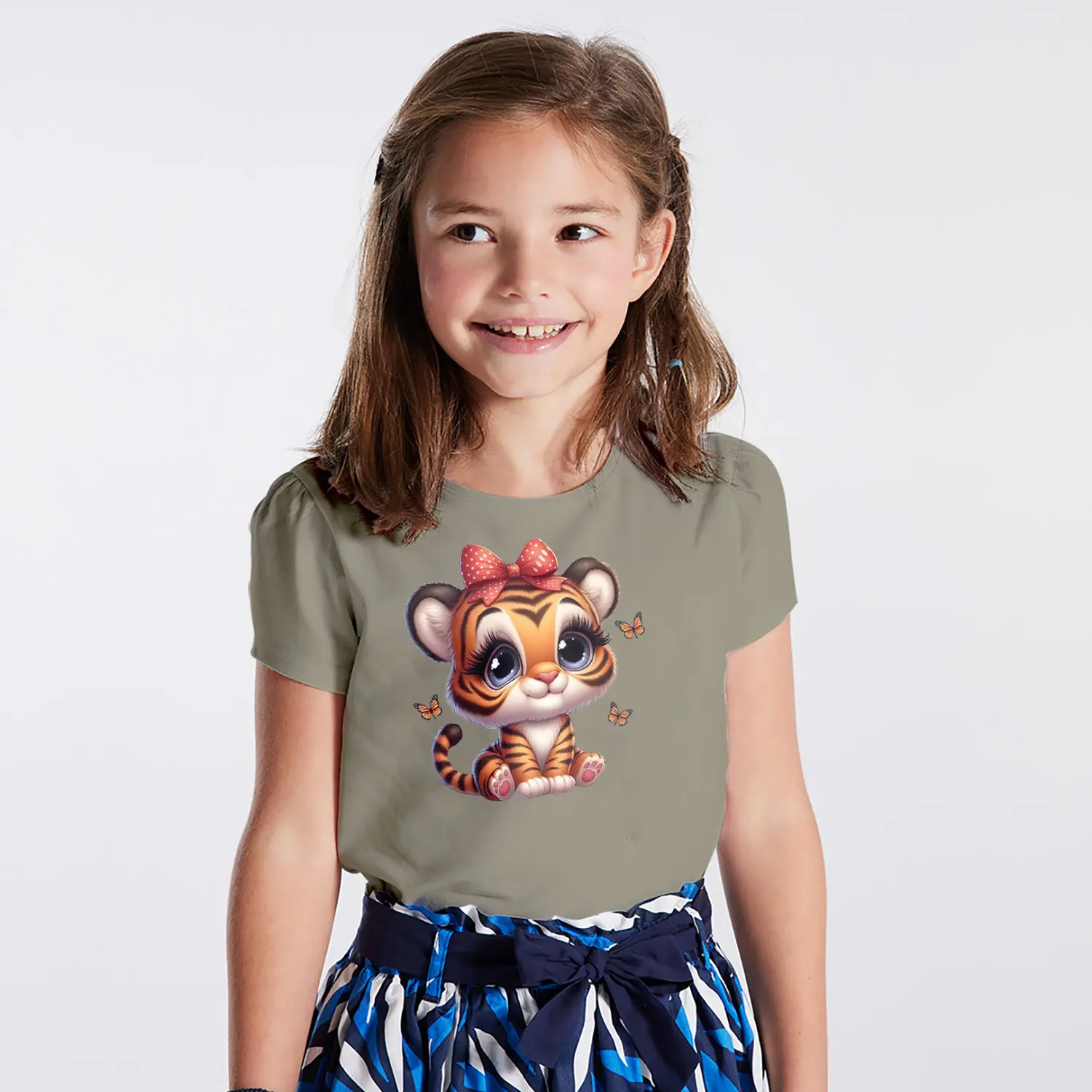 Fiyonklu Kelebek Desenli Sevimli Kaplan Yavrusu Figürlü Baskılı Kız Çocuk Tişörtü