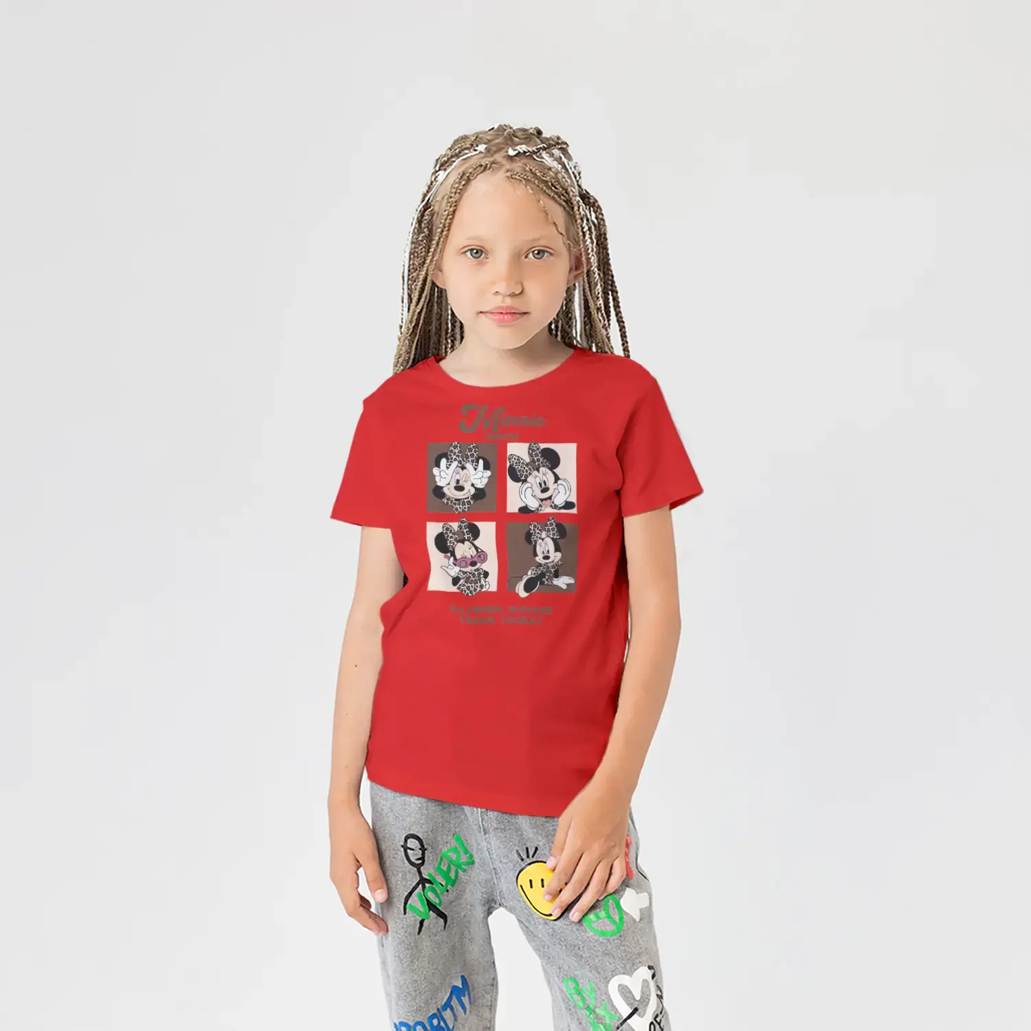 Fiyonklu Moda İkonu Fare Kahraman Dörtlü Kareli Baskılı Kız Çocuk