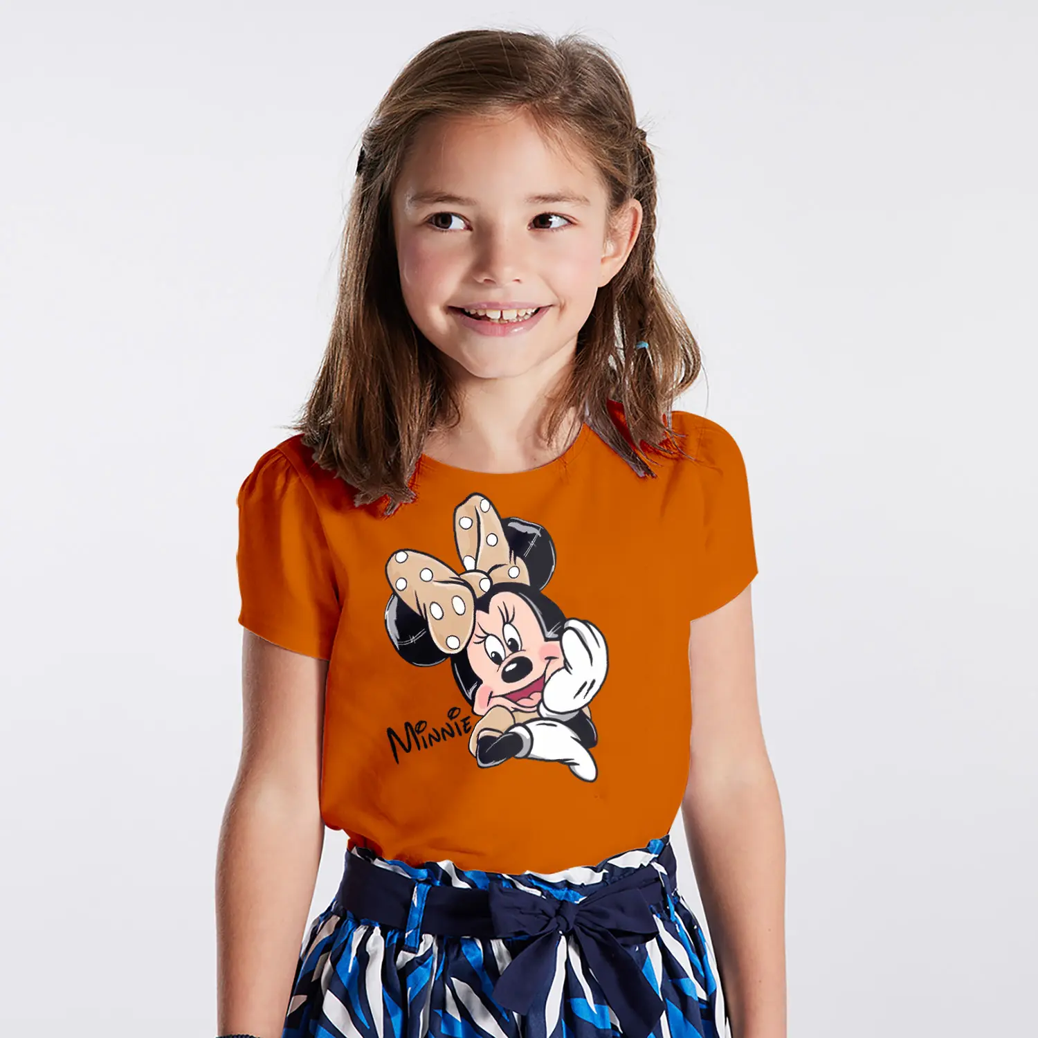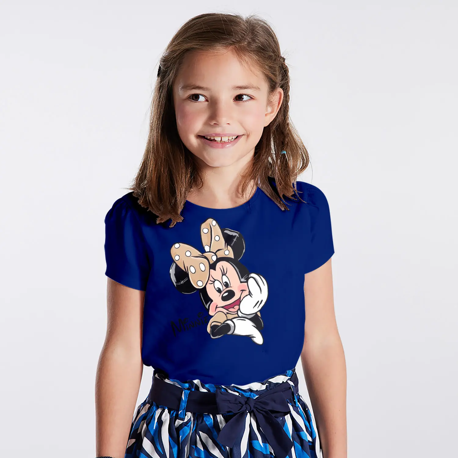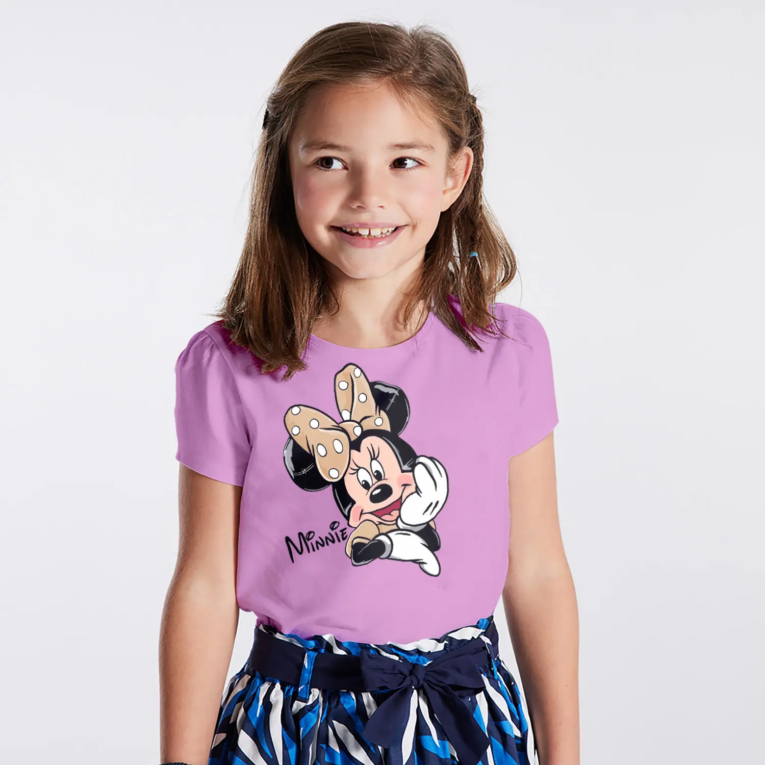 Fiyonklu Yuvarlak Kulaklı Fare Karikatür Minnie Yazılı Baskılı Kız Çocuk Tişörtü