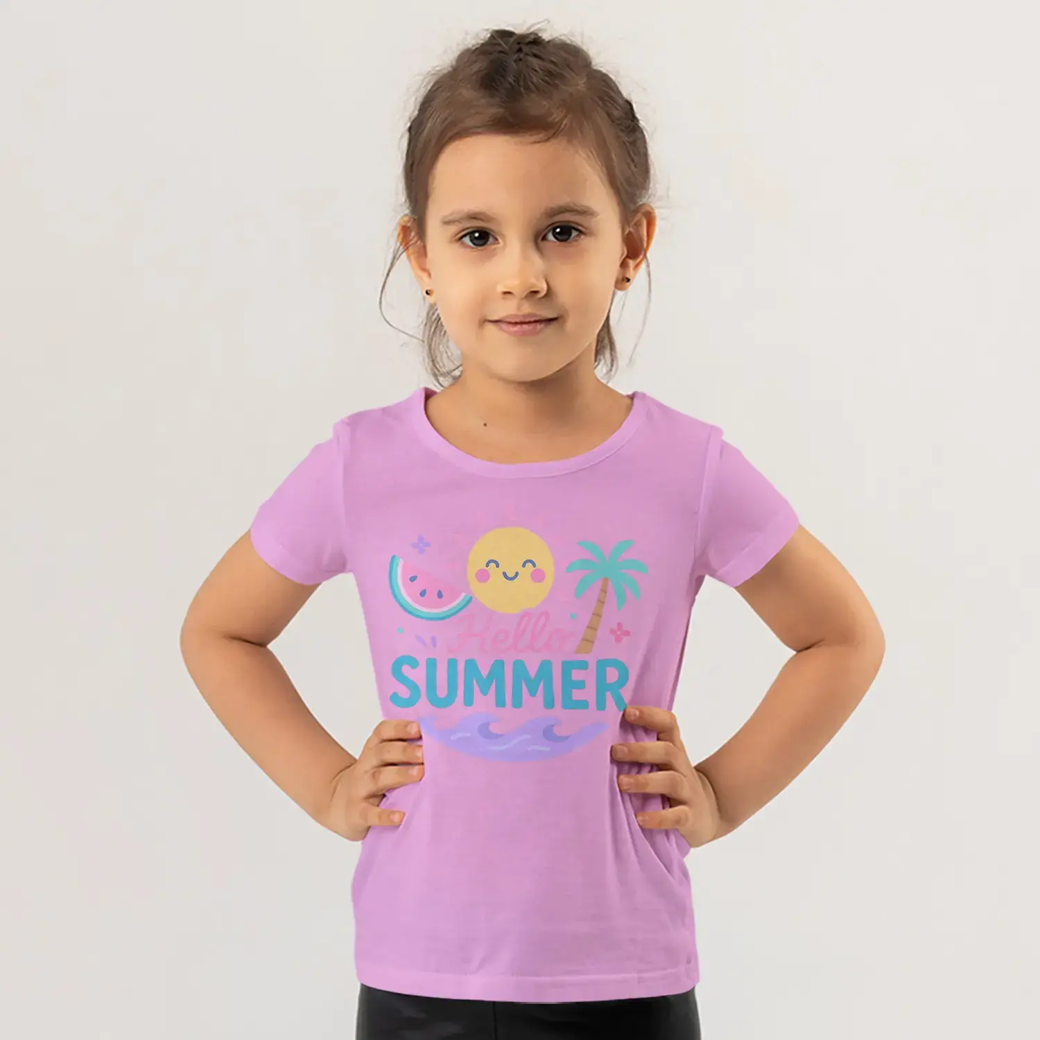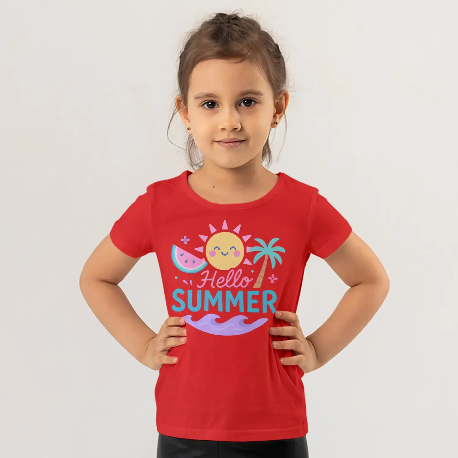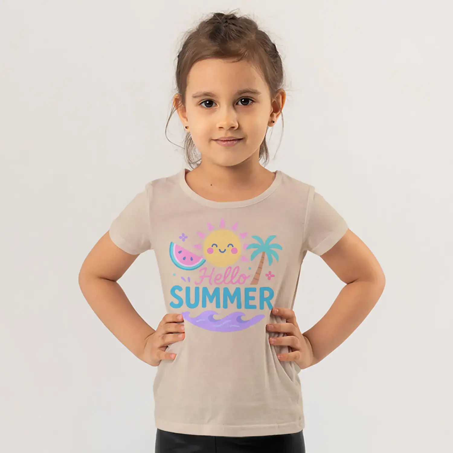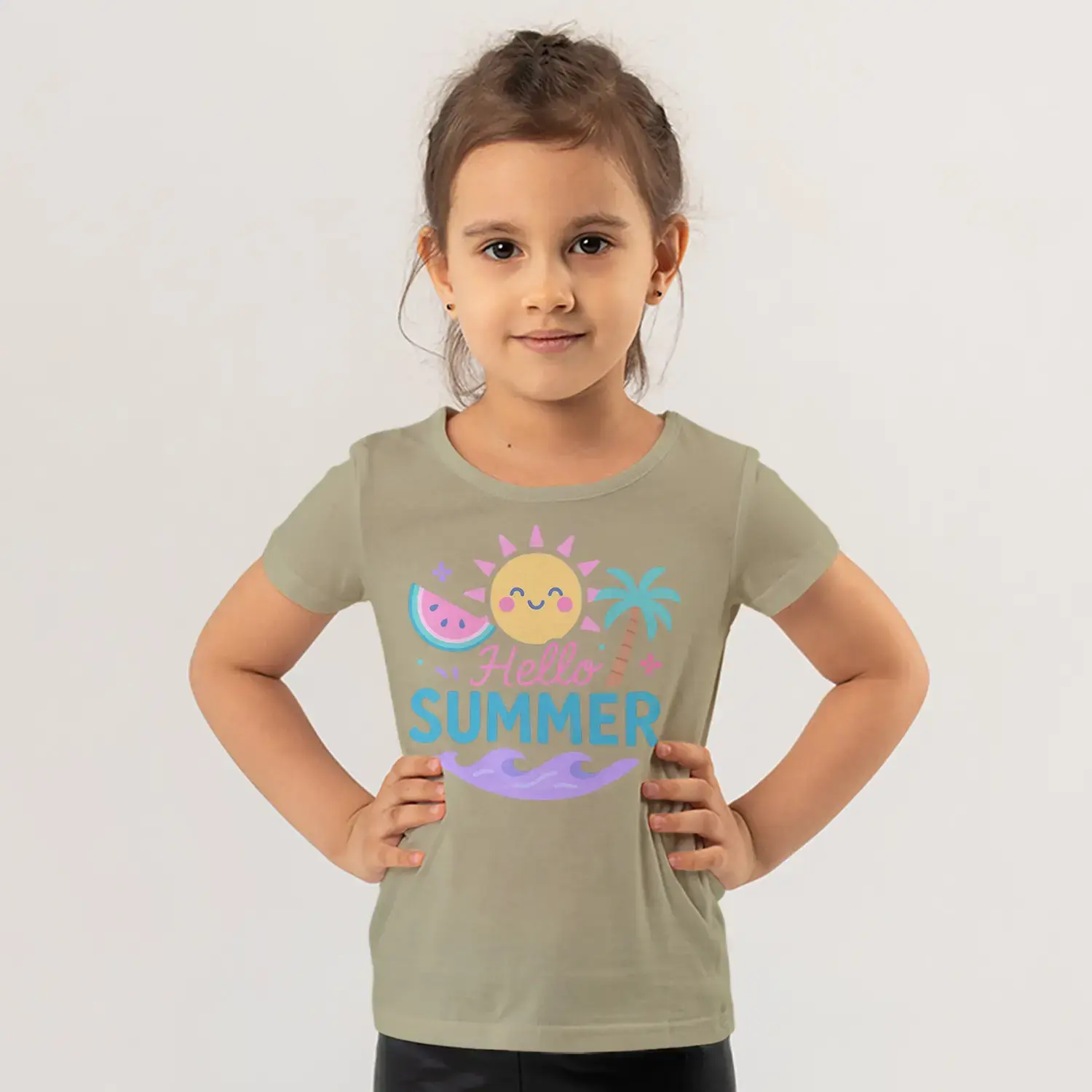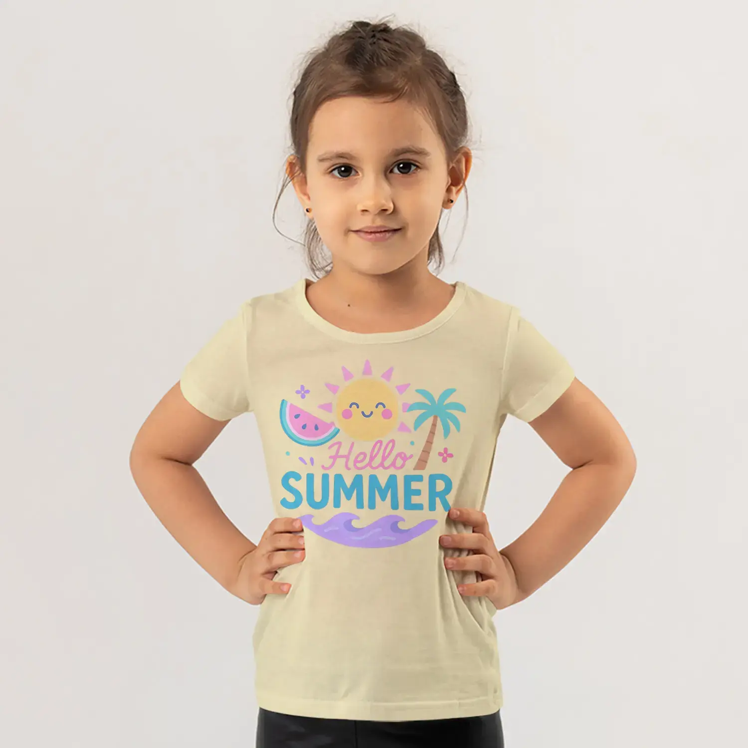 Hello Summer Güneş Palmiye Karpuz Yaz Temalı Baskılı Kız Çocuk Tişörtü