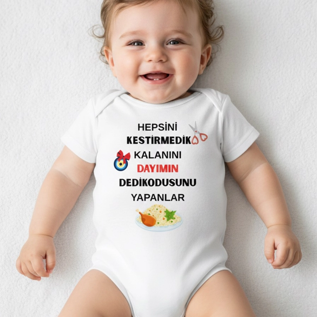 Hepsini Kestirmedim Dayı Dedikodusu Baskılı Zıbın – zarf yaka, çıtçıtlı, rahat kalıp %100 pamuk interlok body.