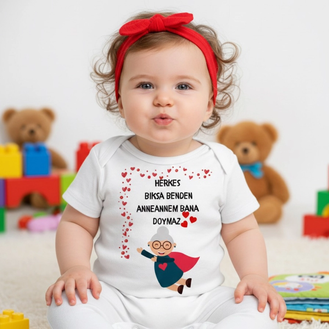 Herkes Bıksa Benden Anneannem Bana Doyamaz Baskılı Zıbın – zarf yaka, çıtçıtlı, rahat kalıp %100 pamuk interlok body.