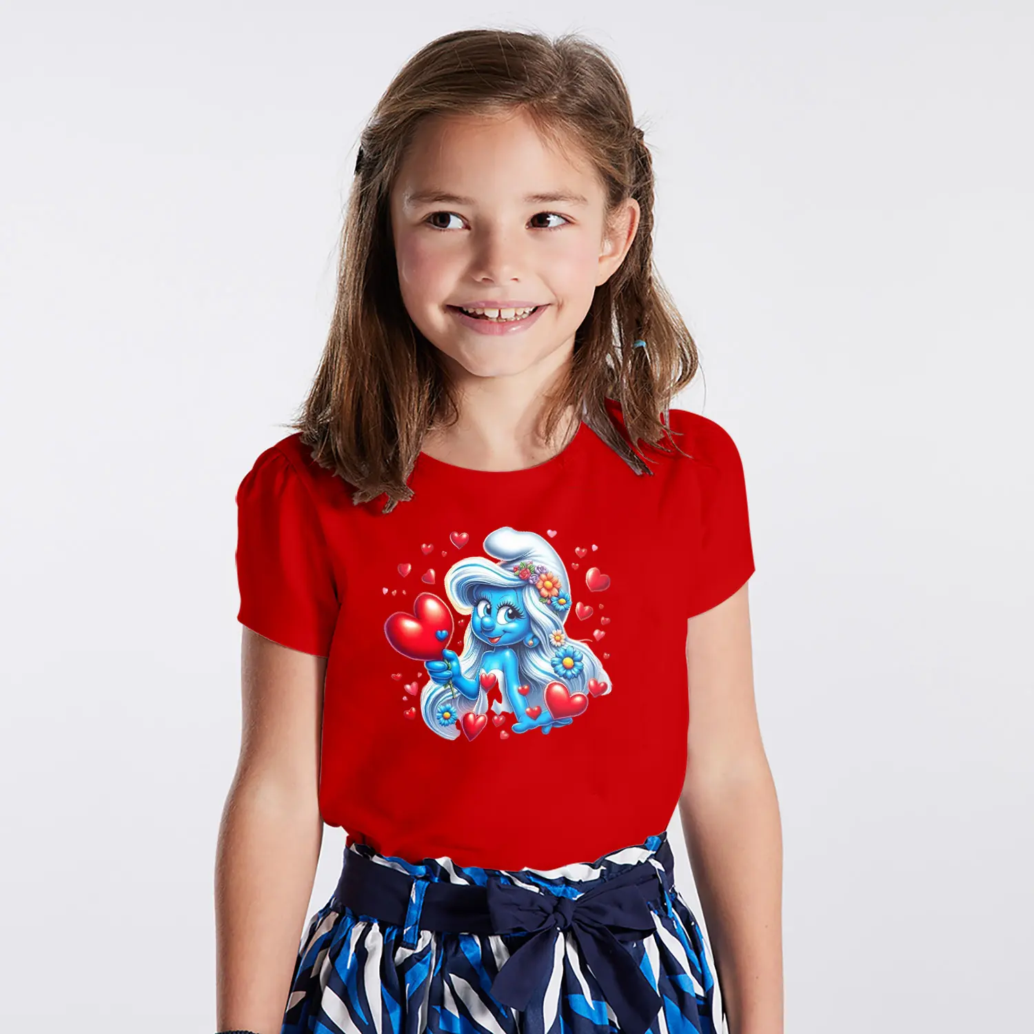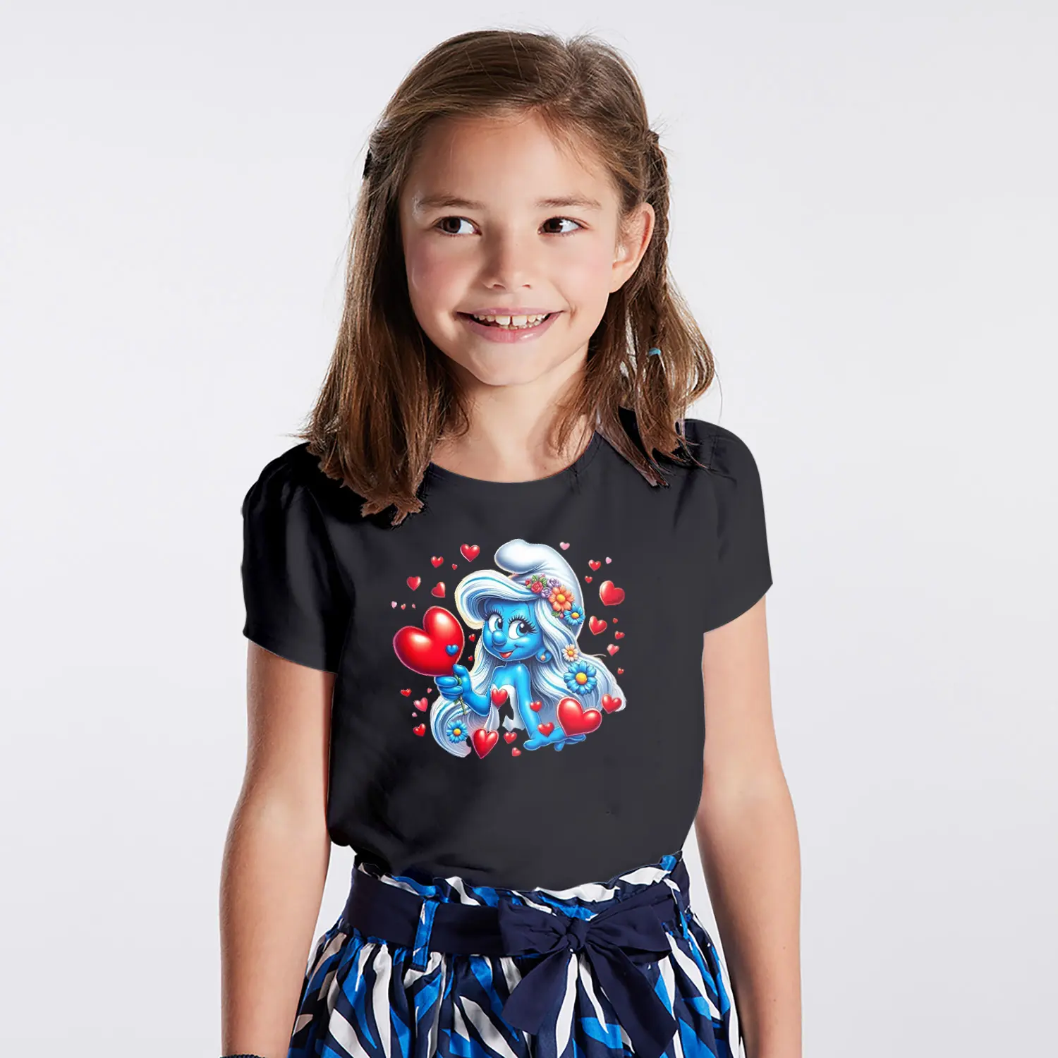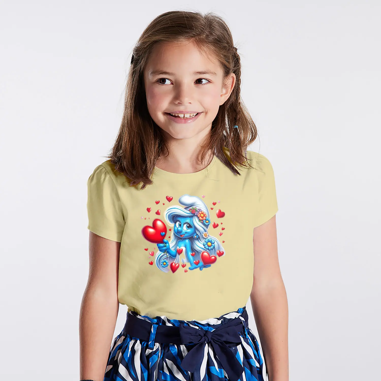 “Kalpli Çiçekli Mavi Cüce Kız Karikatür Figürlü Baskılı Kız Çocuk Tişörtü” için yorum yapan ilk kişi siz olun
