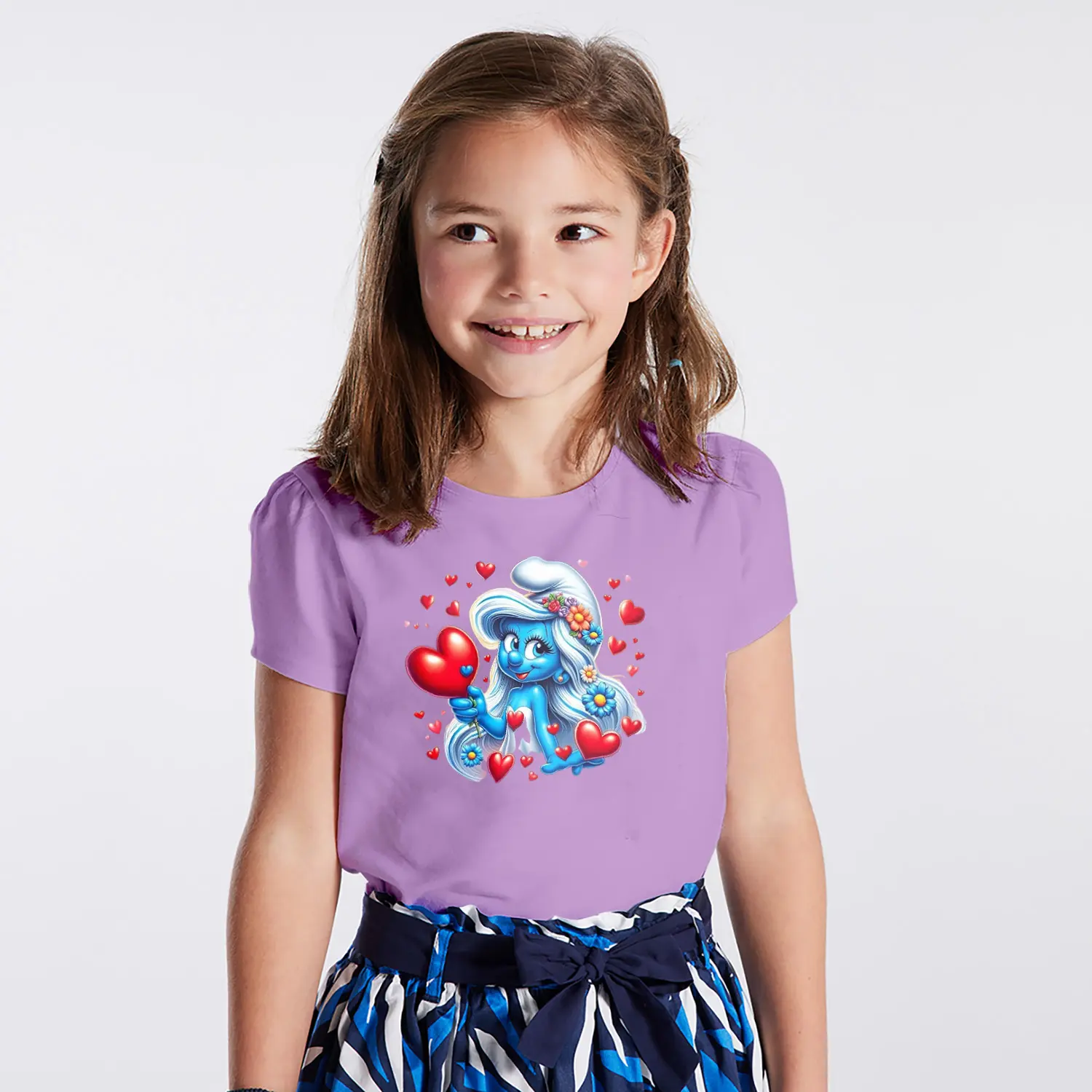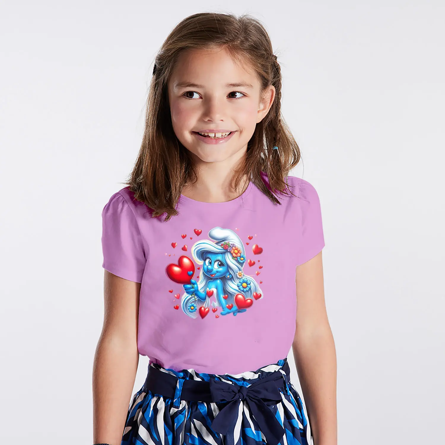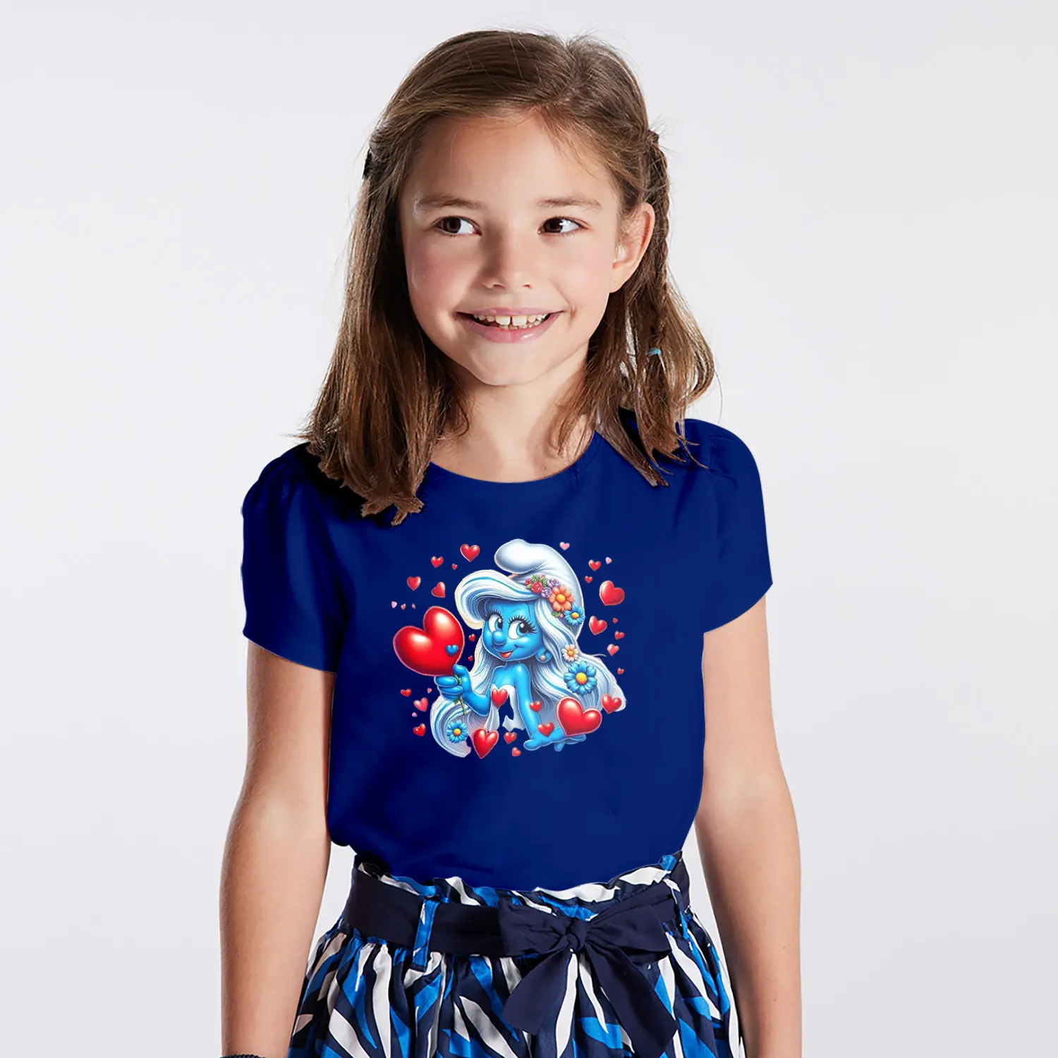 Kalpli Çiçekli Mavi Cüce Kız Karikatür Figürlü Baskılı Kız Çocuk Tişörtü