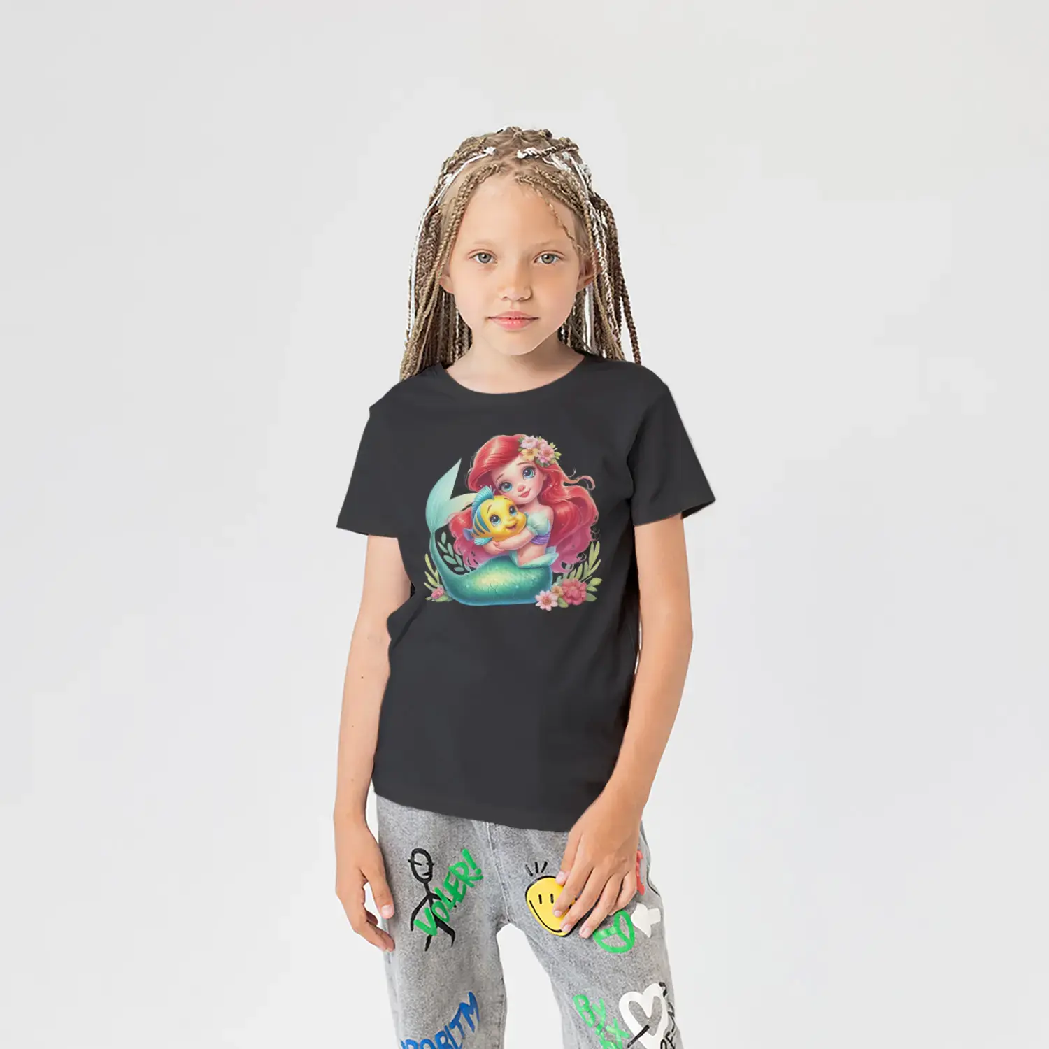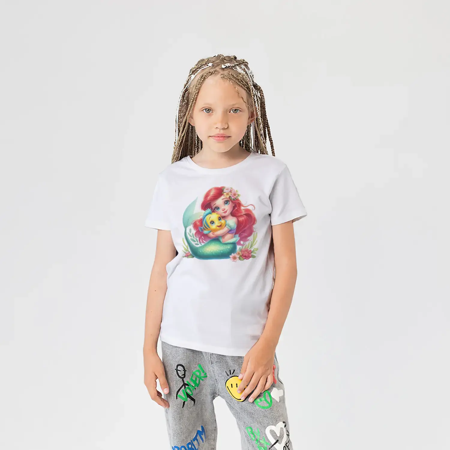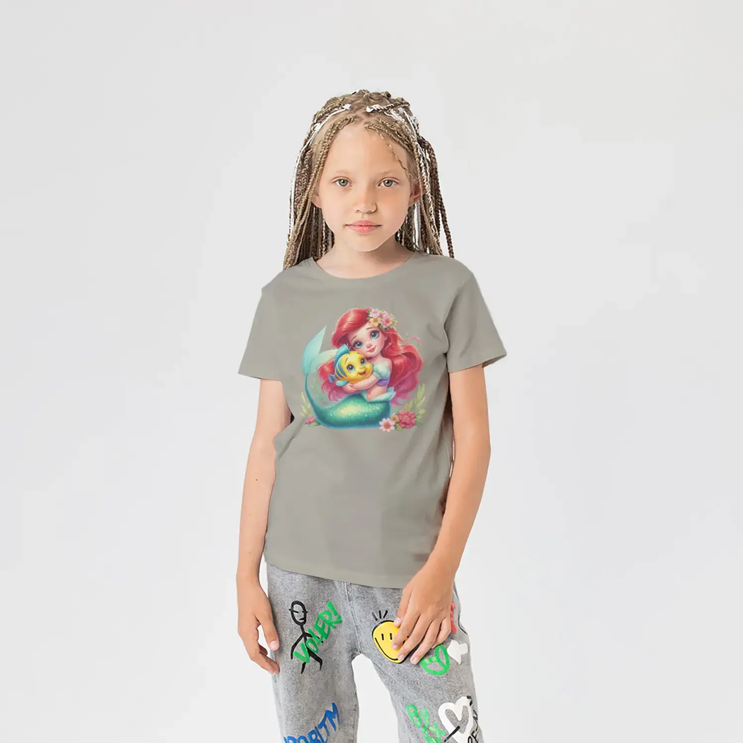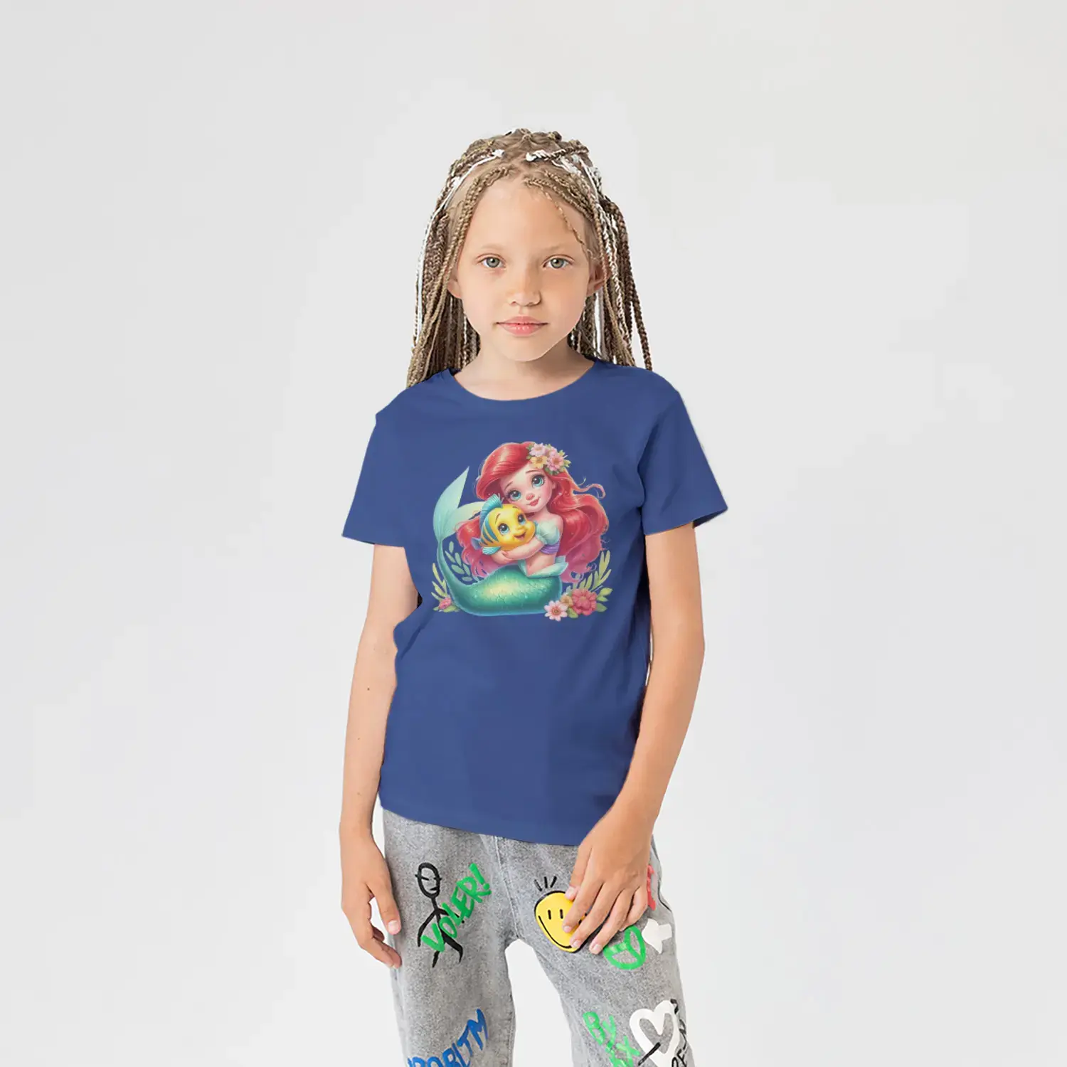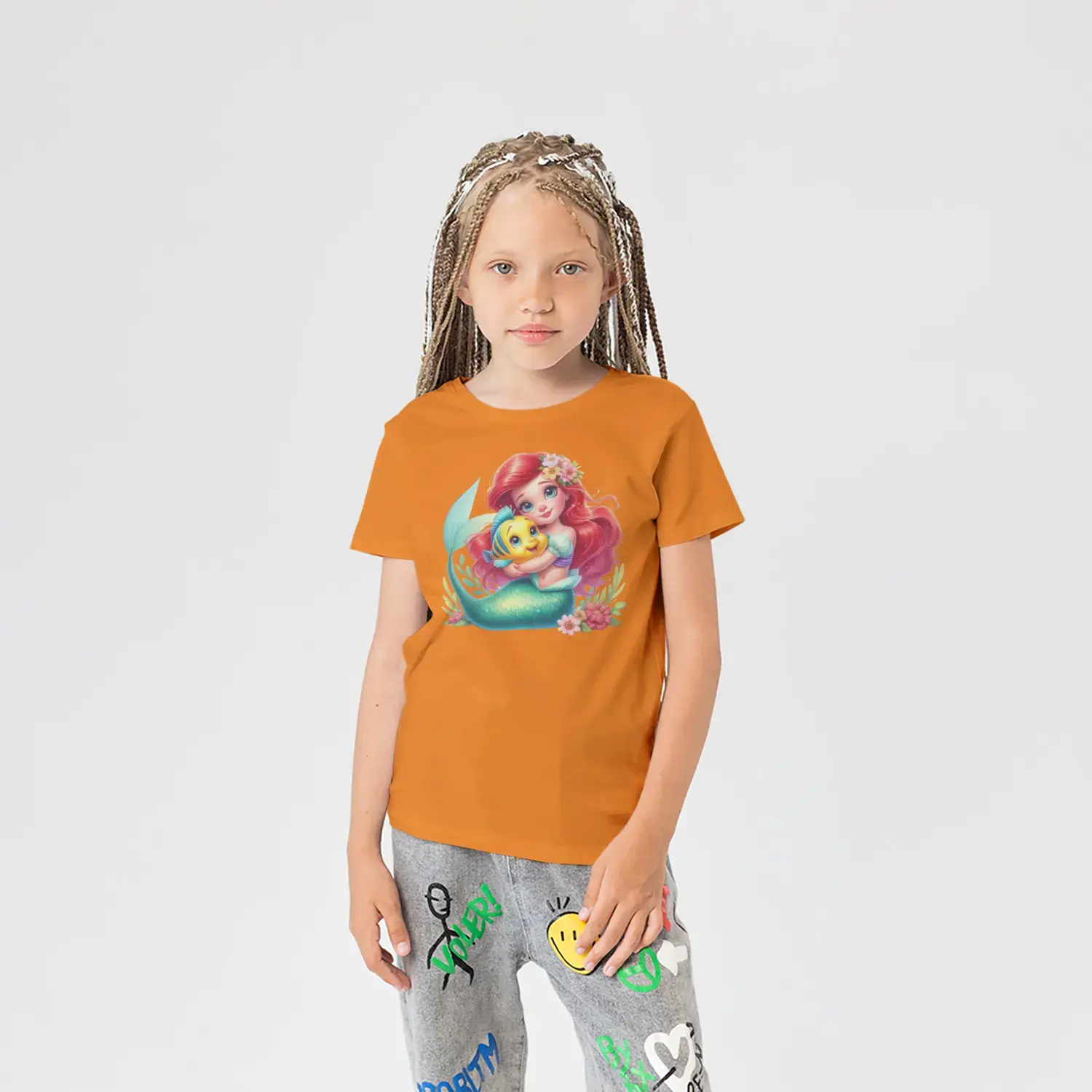 Kızıl Saçlı Deniz Kızı ve Sarı Balık Arkadaşı Baskılı Kız Çocuk Tişörtü