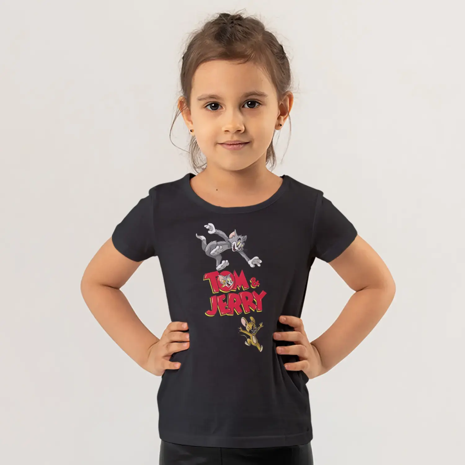 Kovalayan Gri Kedi ve Kaçan Küçük Fare İkili Karikatür Baskılı Kız Çocuk Tişörtü