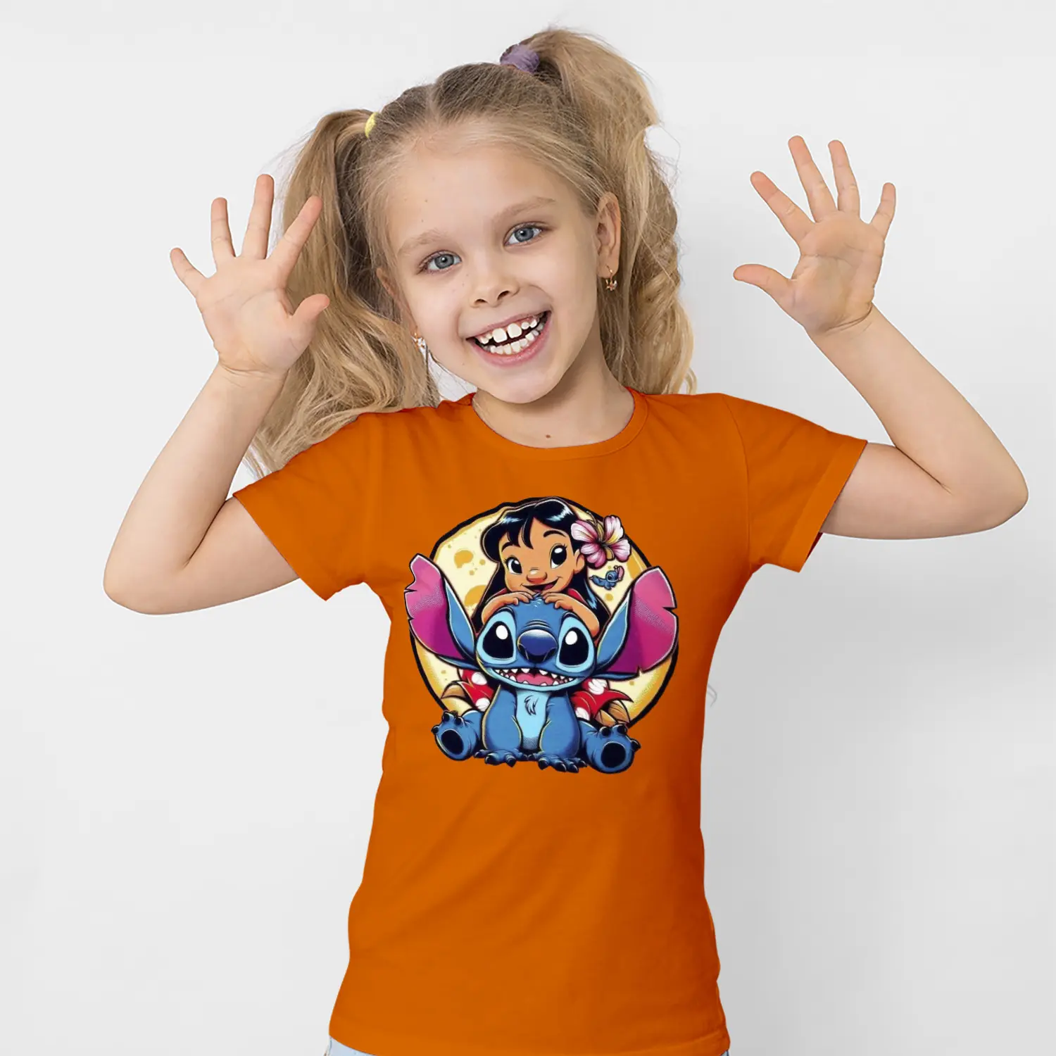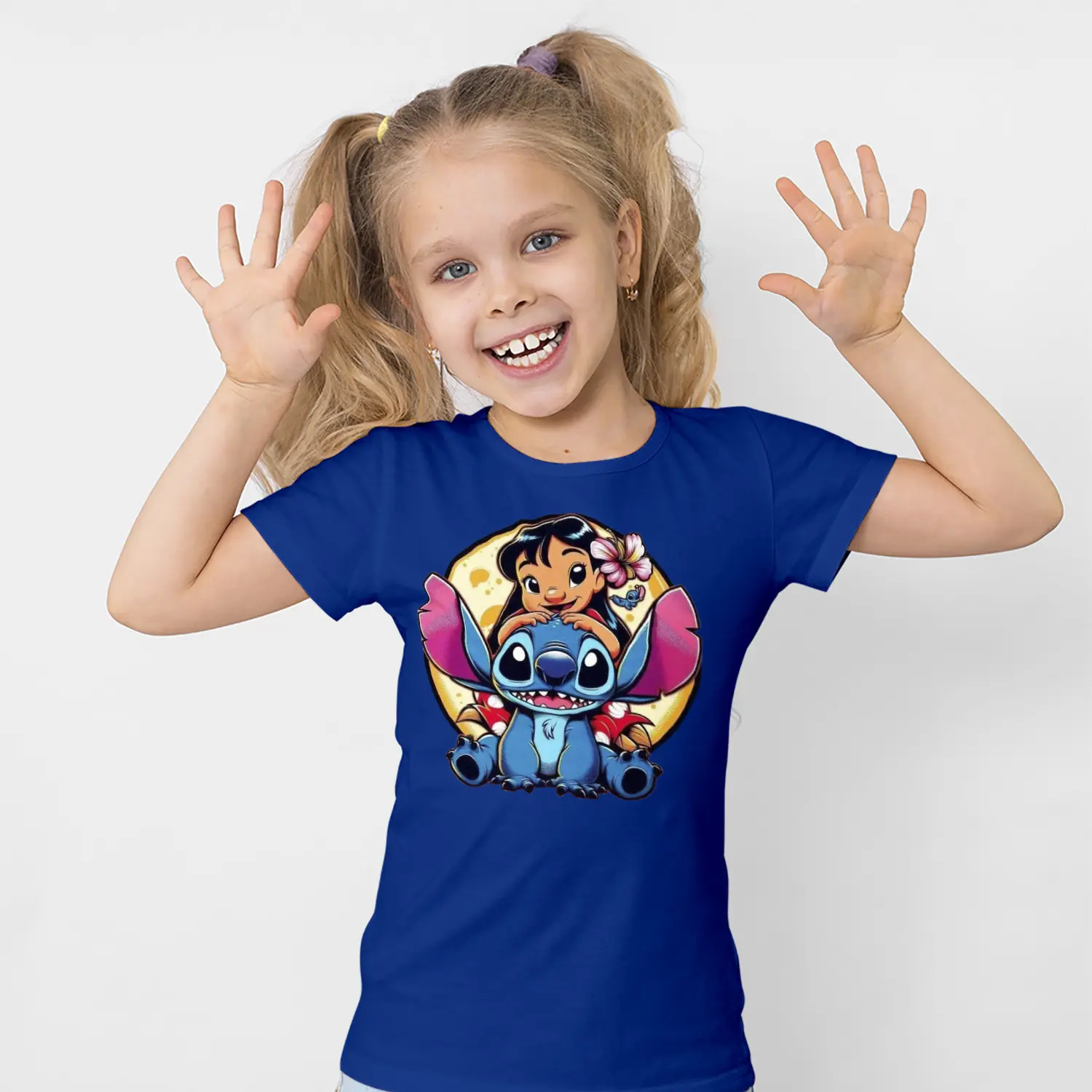 Mavi Uzaylı Yaratık ve Çiçekli Kız Karikatür Figürlü Baskılı Kız Çocuk Tişörtü