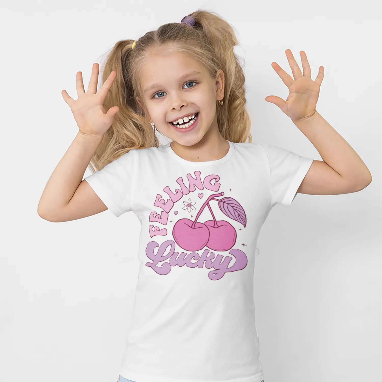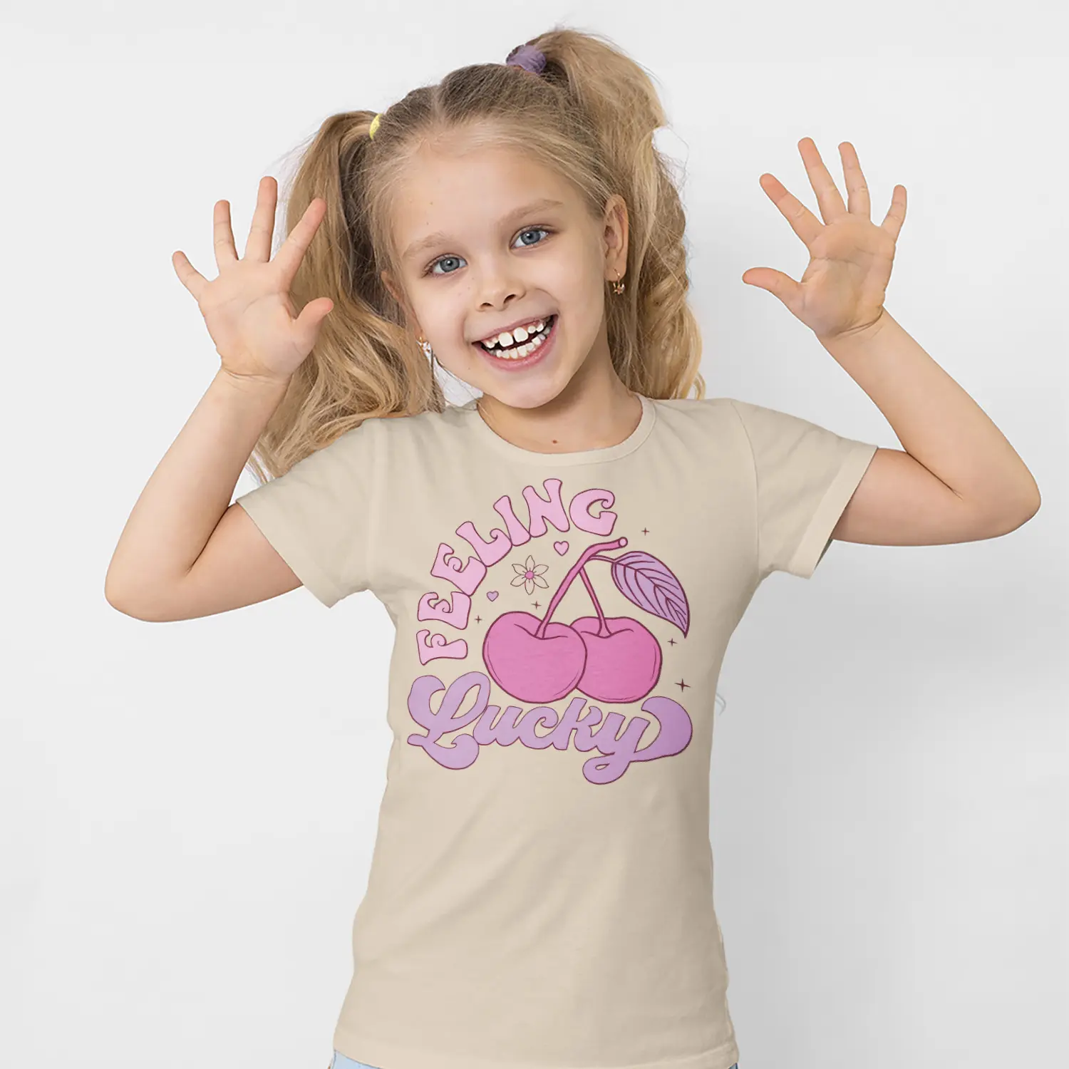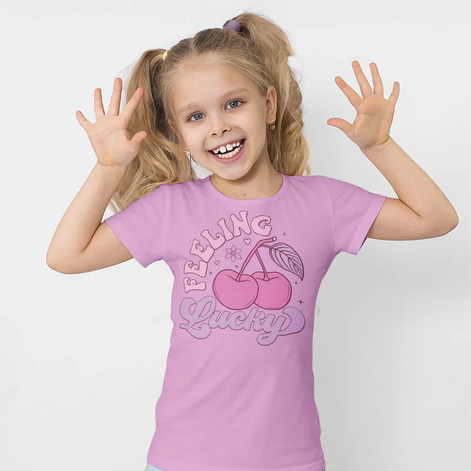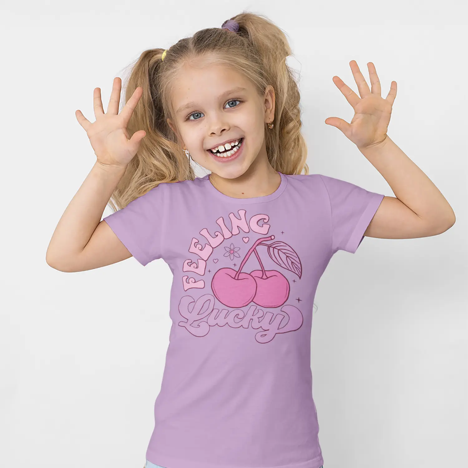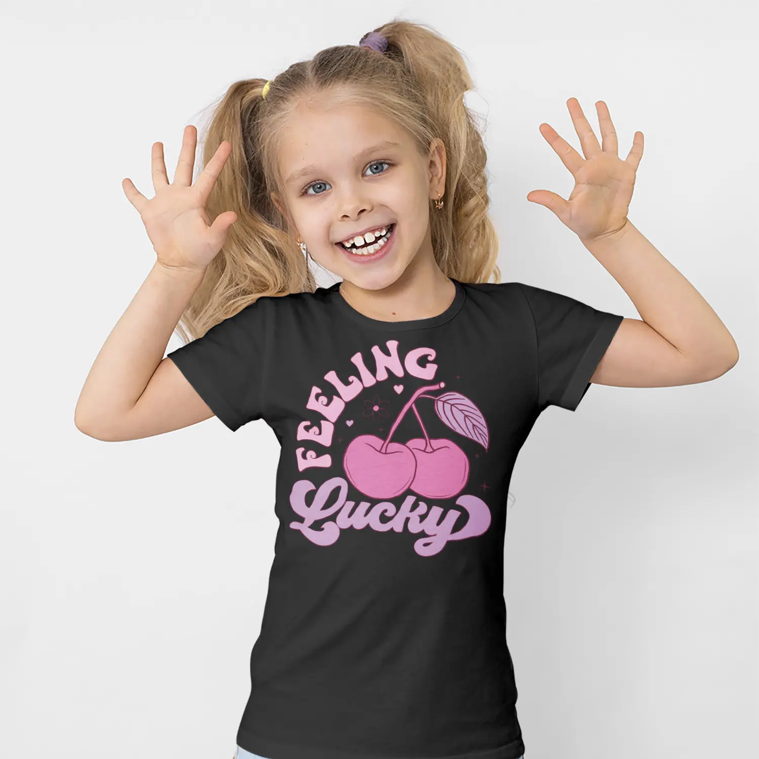 Pembe Kiraz ve Feeling Lucky Yazılı Baskılı Kız Çocuk Tişörtü