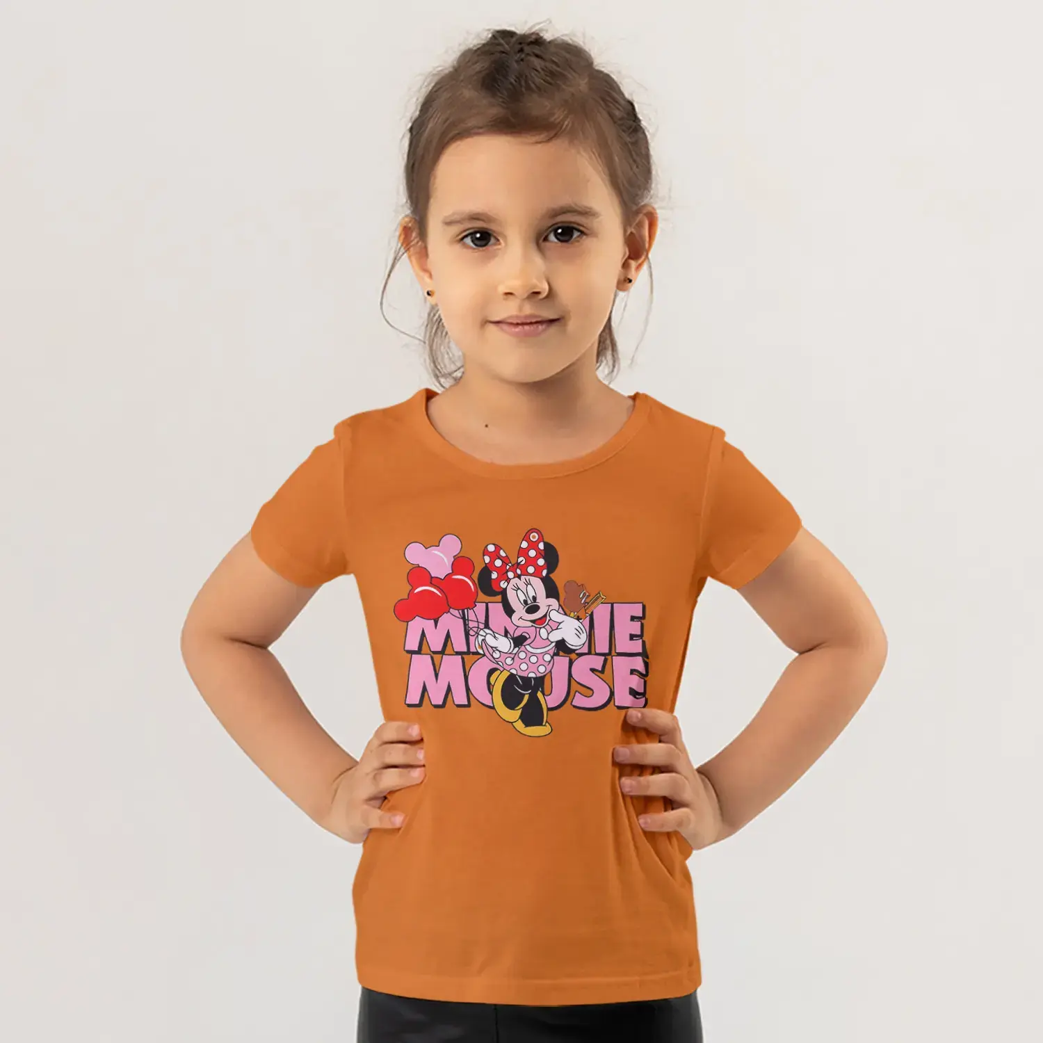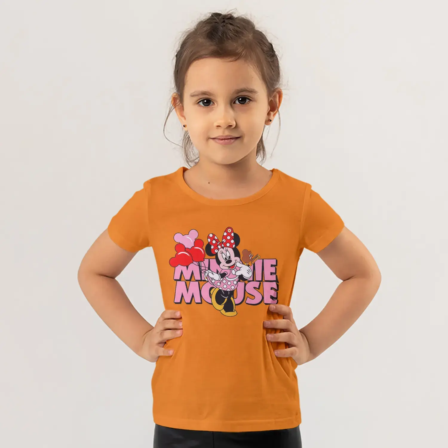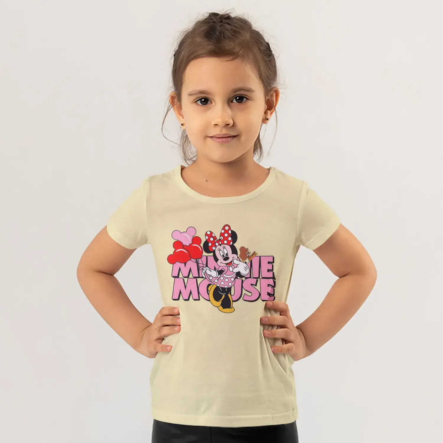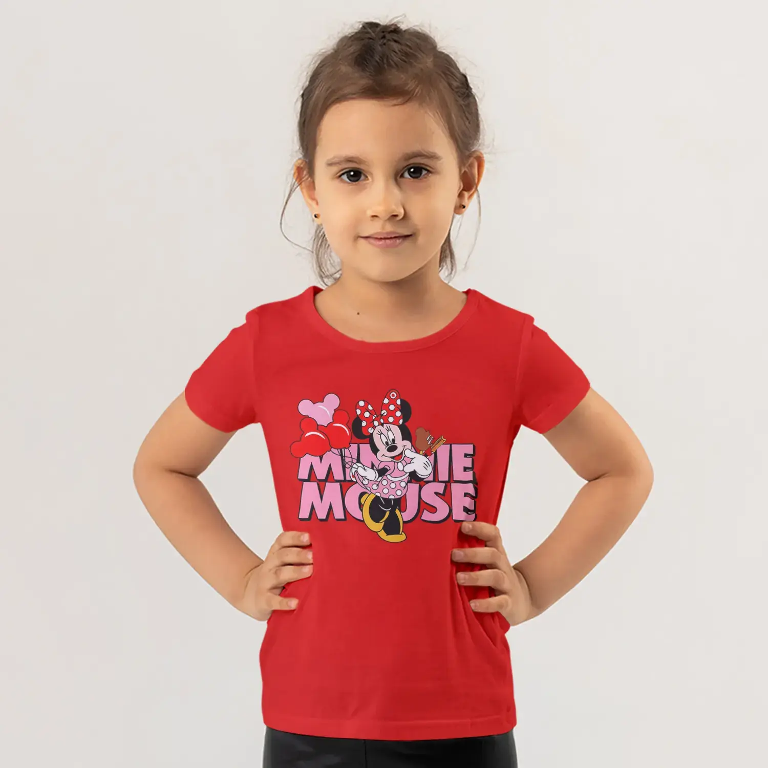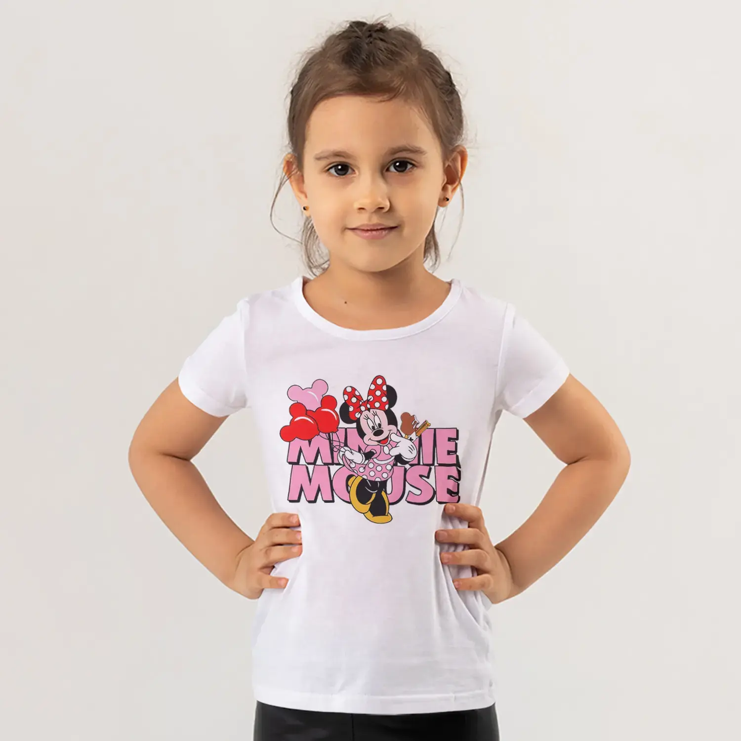 Pembe Puantiyeli Elbiseli Fare Kız Balon Tutuyor Pembe Yazılı Baskılı Kız Çocuk Tişörtü