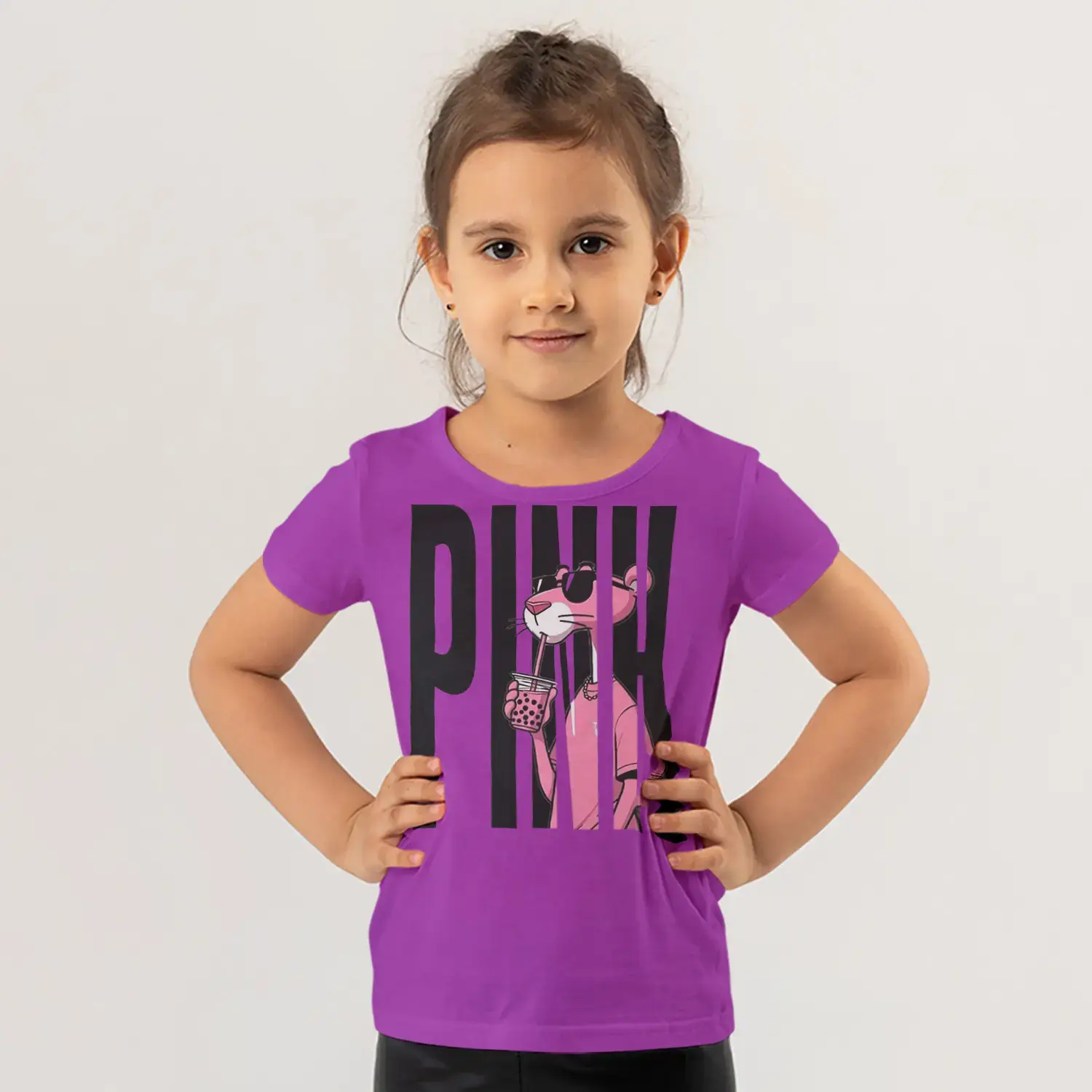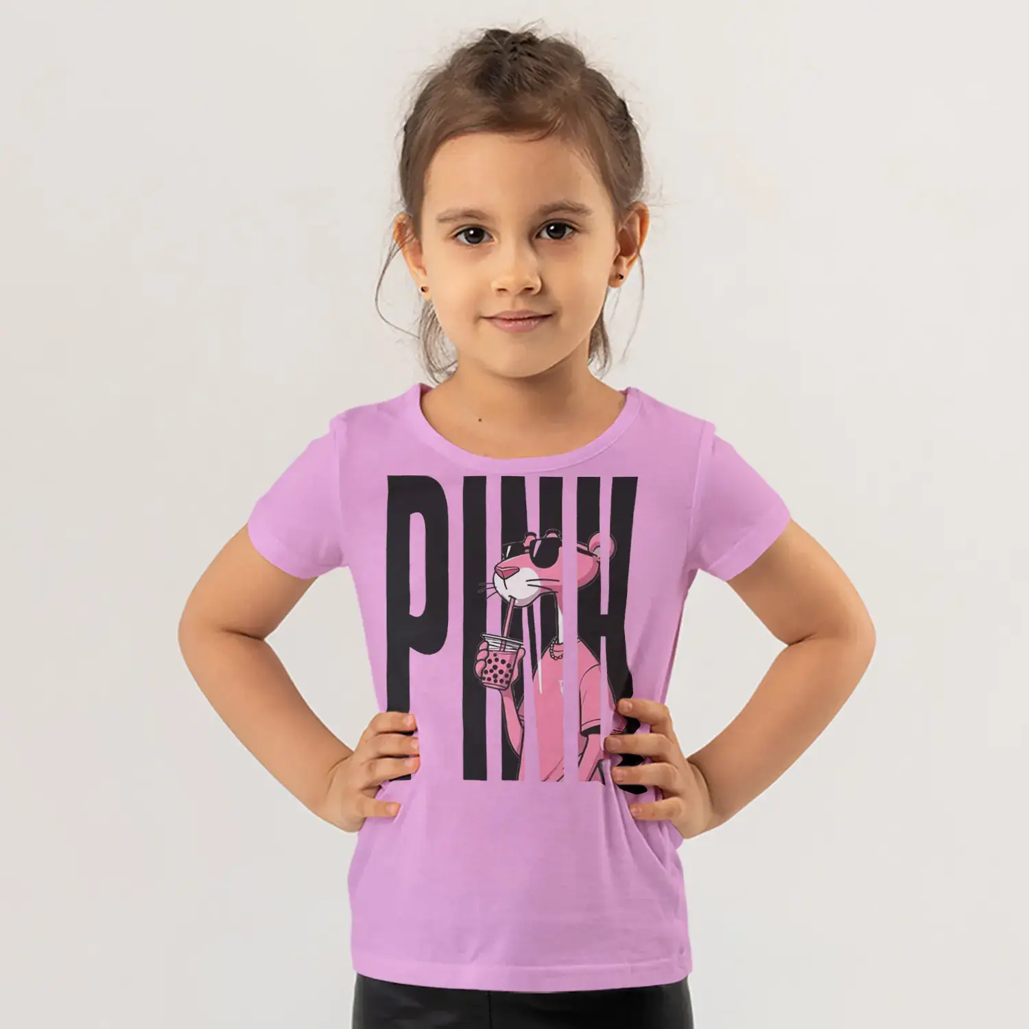 Pink Yazılı Güneş Gözlüklü Pembe Panter Baskılı Kız Çocuk Tişörtü