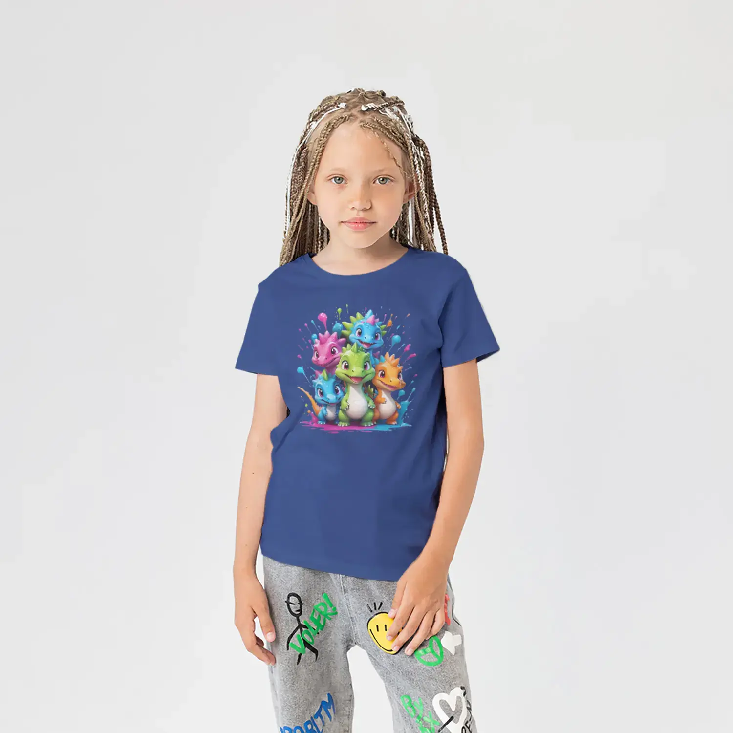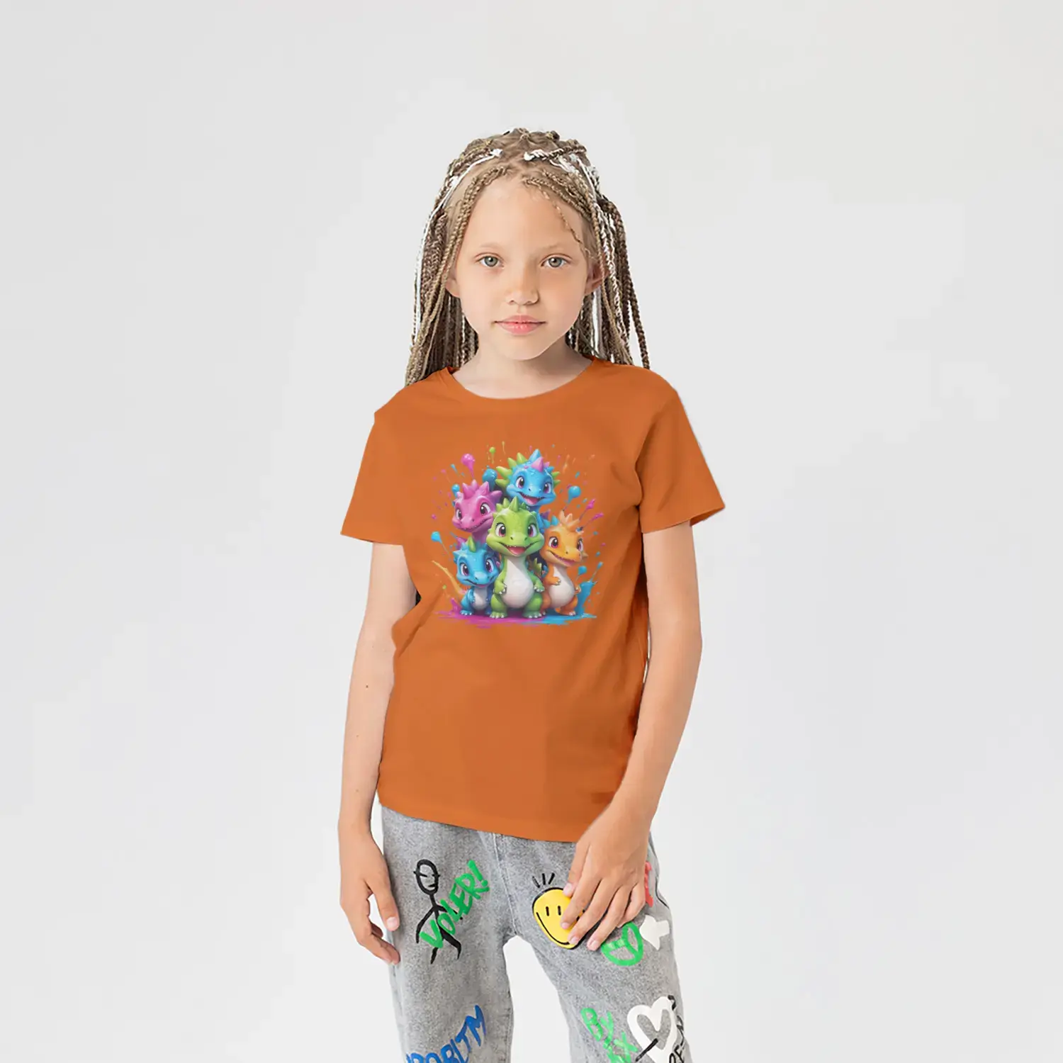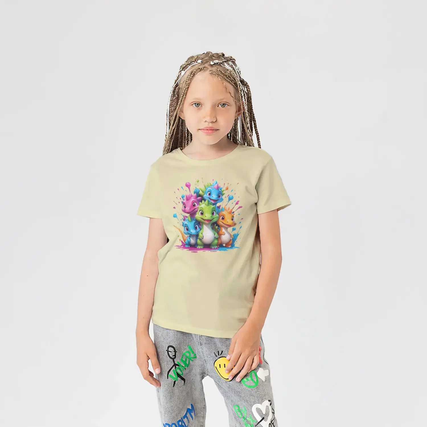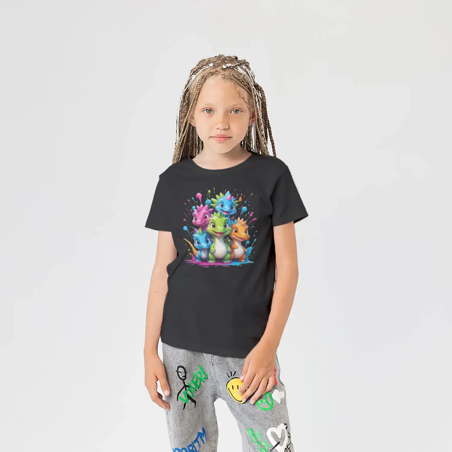 Renkli Boya Sıçramalı Sevimli Dinozor Grubu Baskılı Kız Çocuk