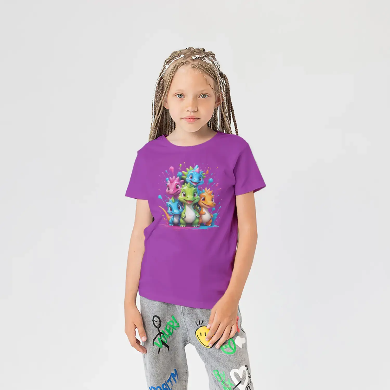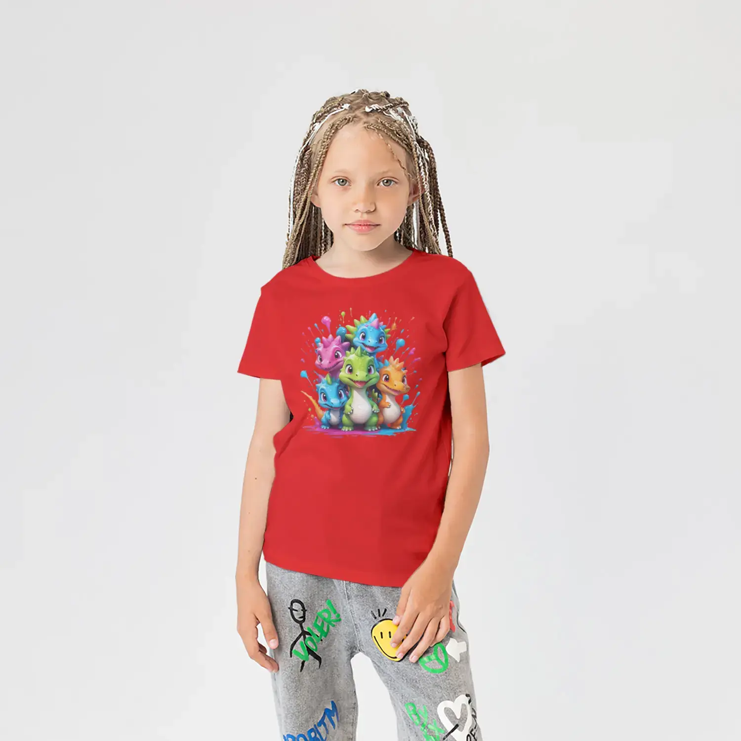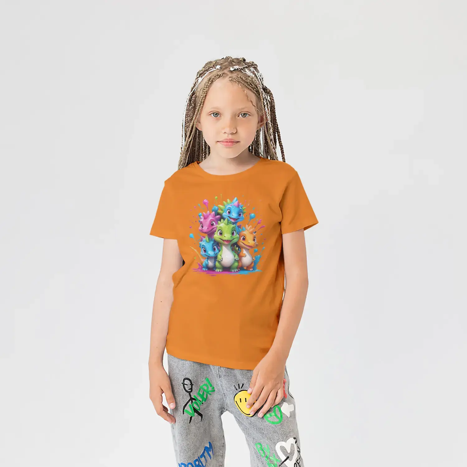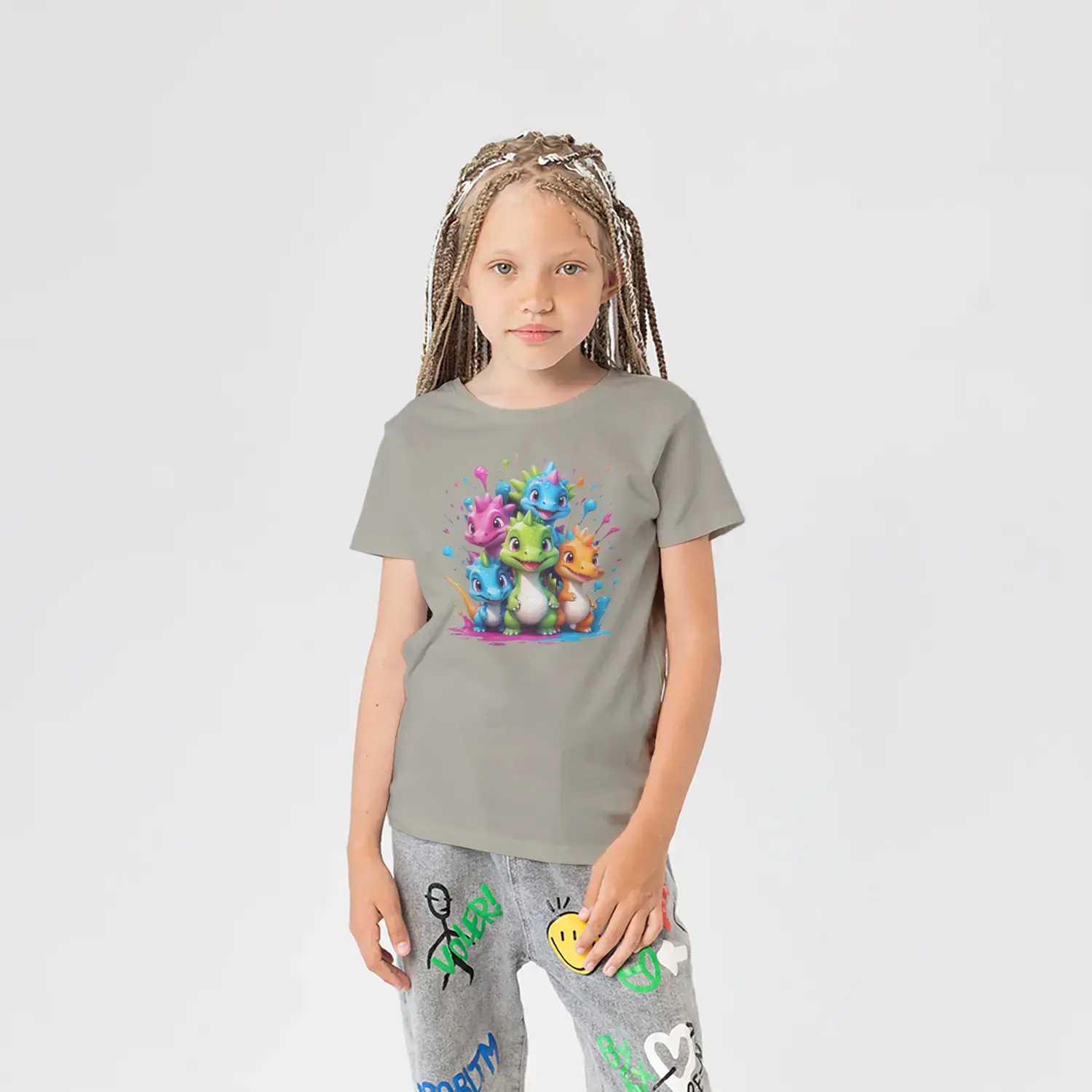 Renkli Boya Sıçramalı Sevimli Dinozor Grubu Baskılı Kız Çocuk
