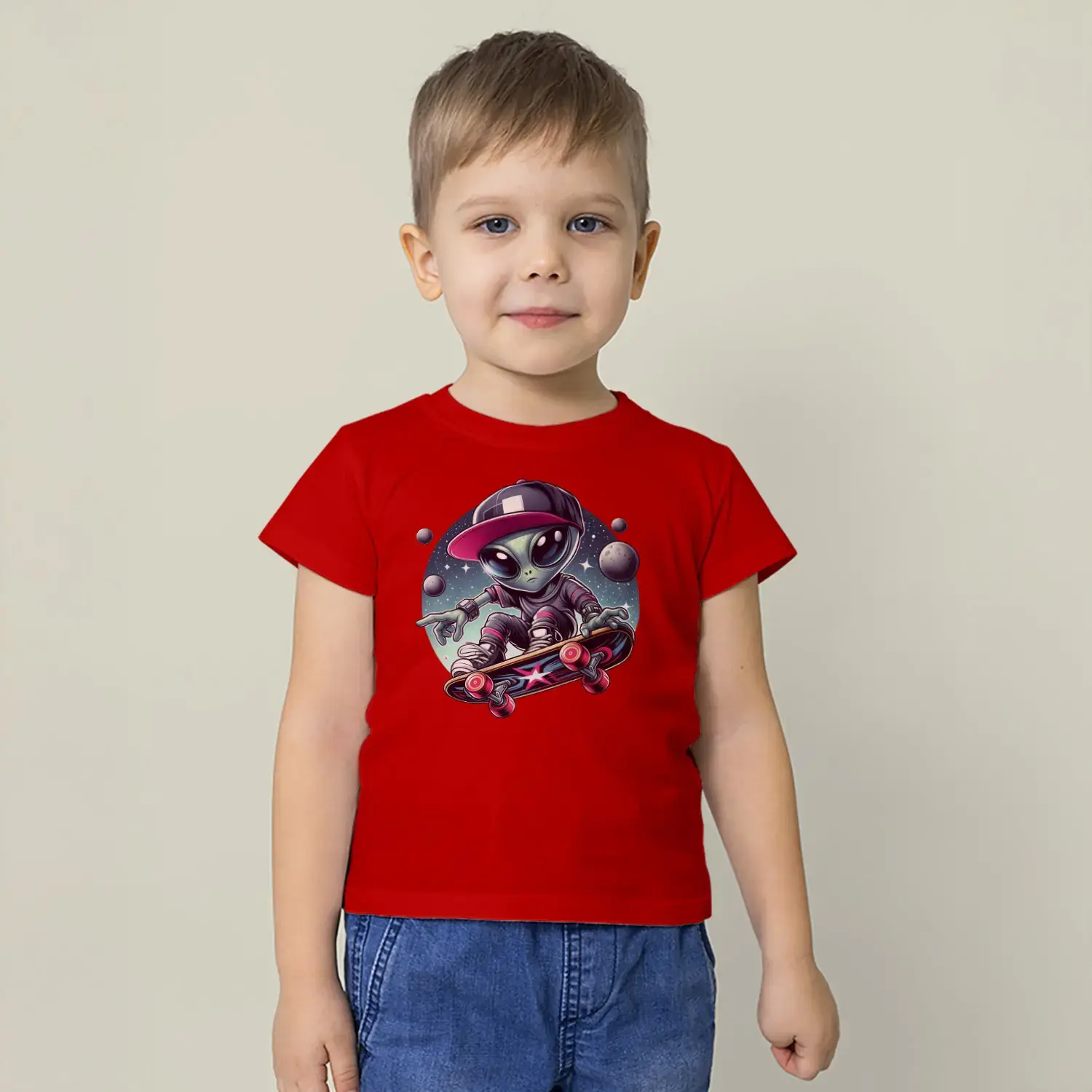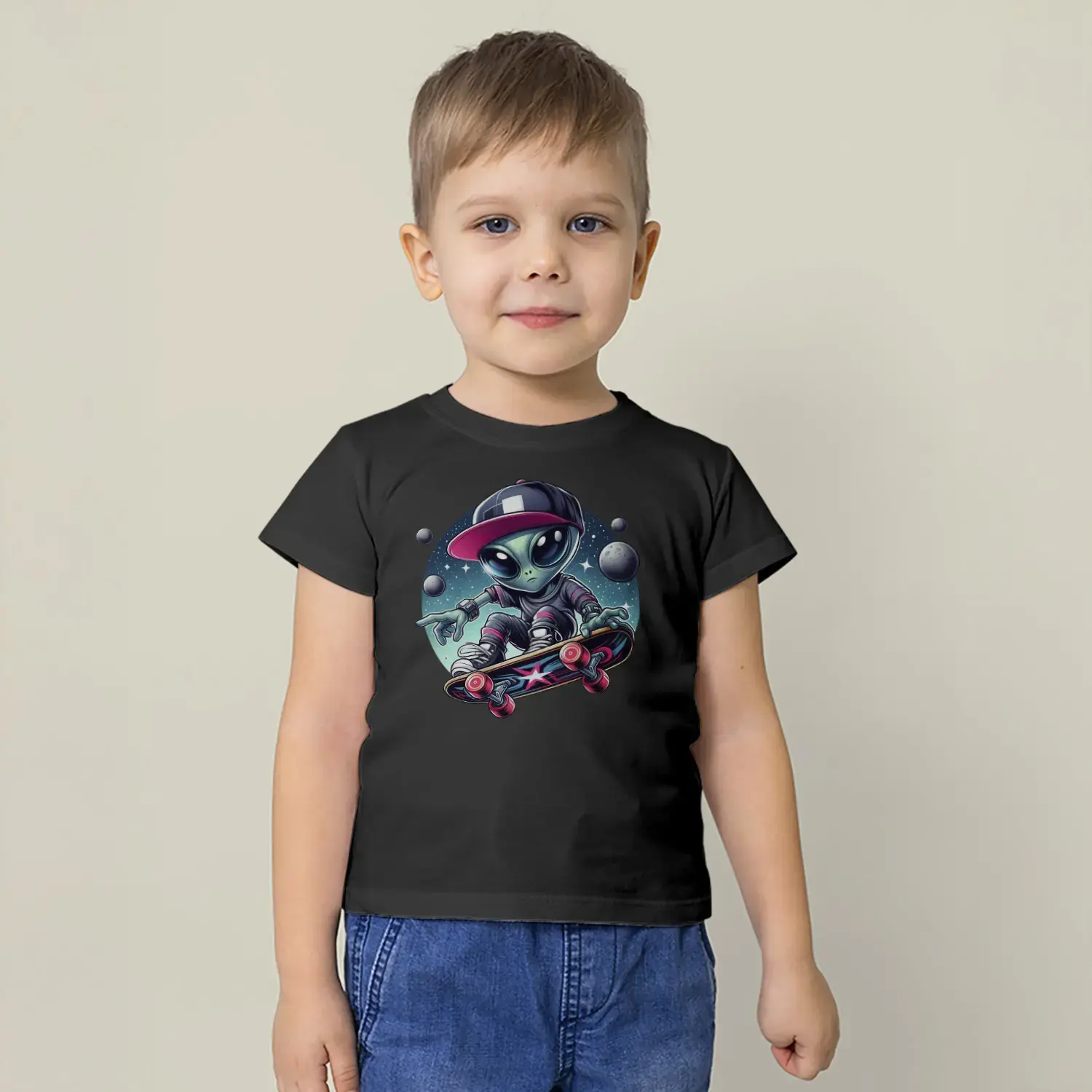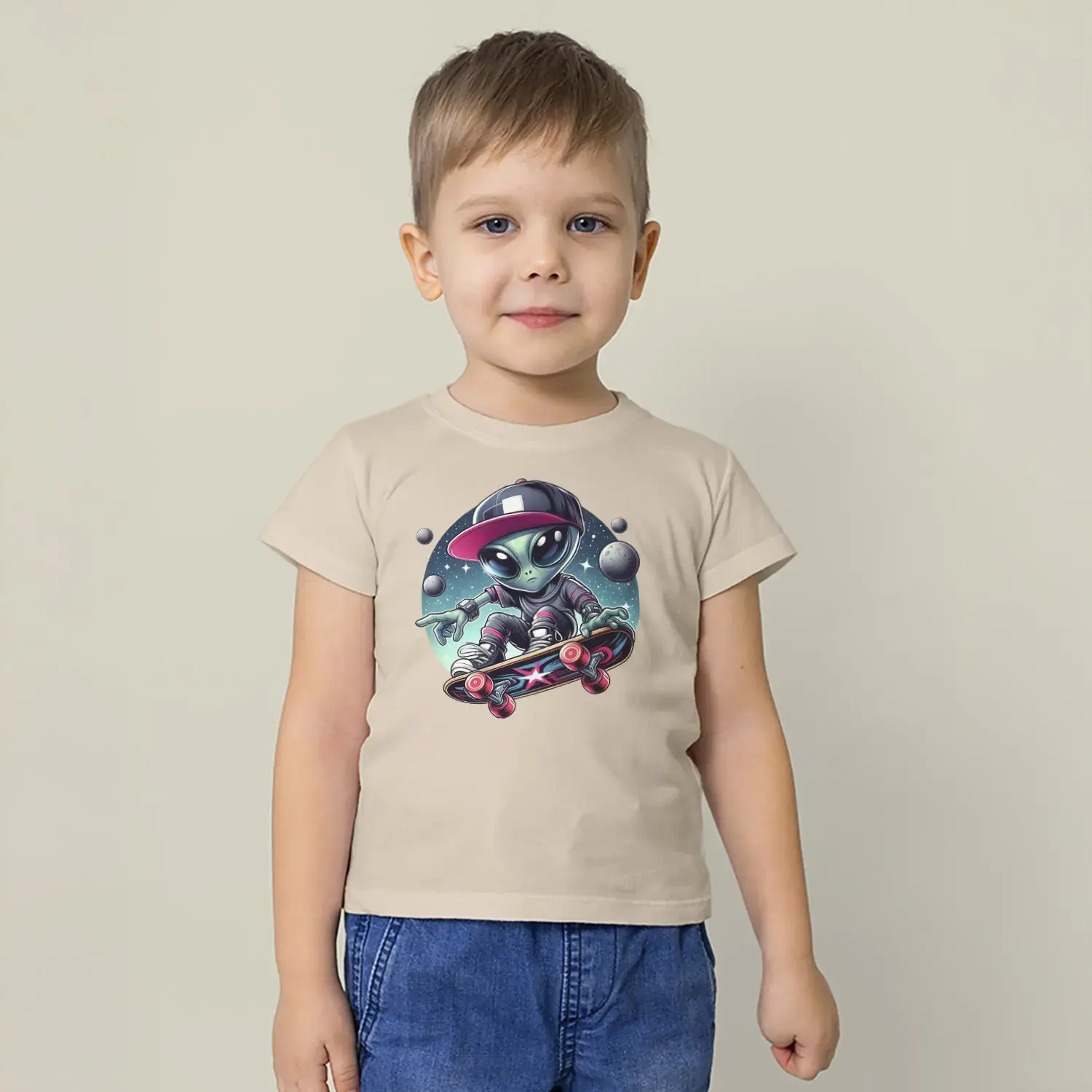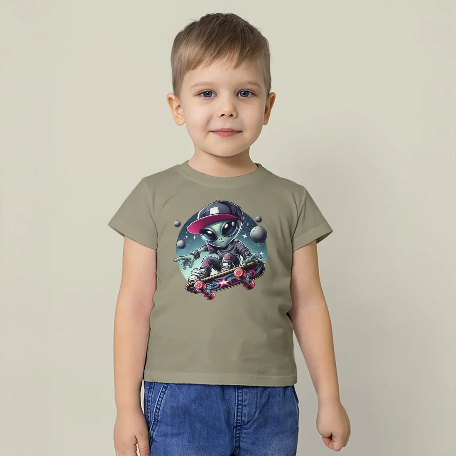 Uzaylı Kaykayda Uzay Temalı Baskılı Erkek Çocuk Tişört